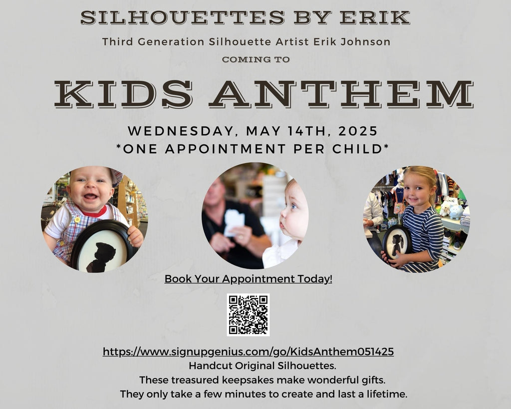 With Mr. Johnson's unique talent, he cuts each silhouette free hand by looking at a person's profile to get an exact likeness. Silhouettes are treasured keepsakes and make wonderful gifts.