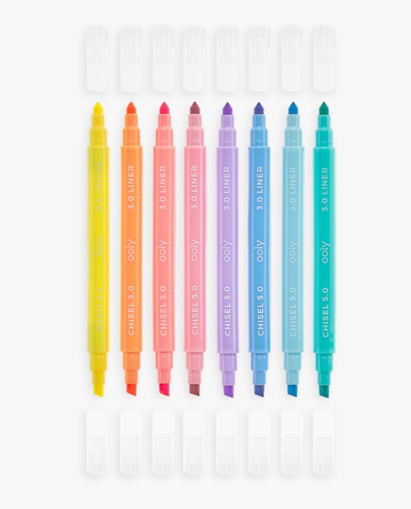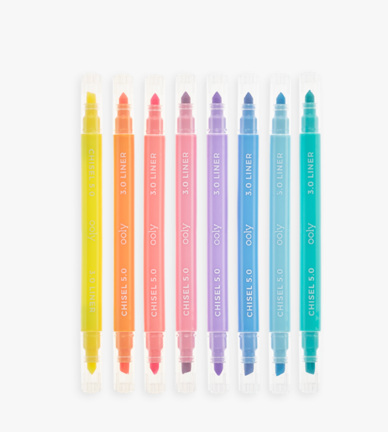 Draw and highlight with beautifully bright pastel colors with the Pastel Liners marker set. Pastel Liners are a set of 8 pastel markers with dual tips on each marker. One side is a 5mm chisel tip so you can use it as a pastel highlighter pen. The other end is a 3mm fine tip marker that you can use to sketch, color, draw and write in beautiful pastel colors. Your school, office or homework will never be boring again when you have a marker set that can color, write and highlight at the same time . Suitable for ages 6 and up.