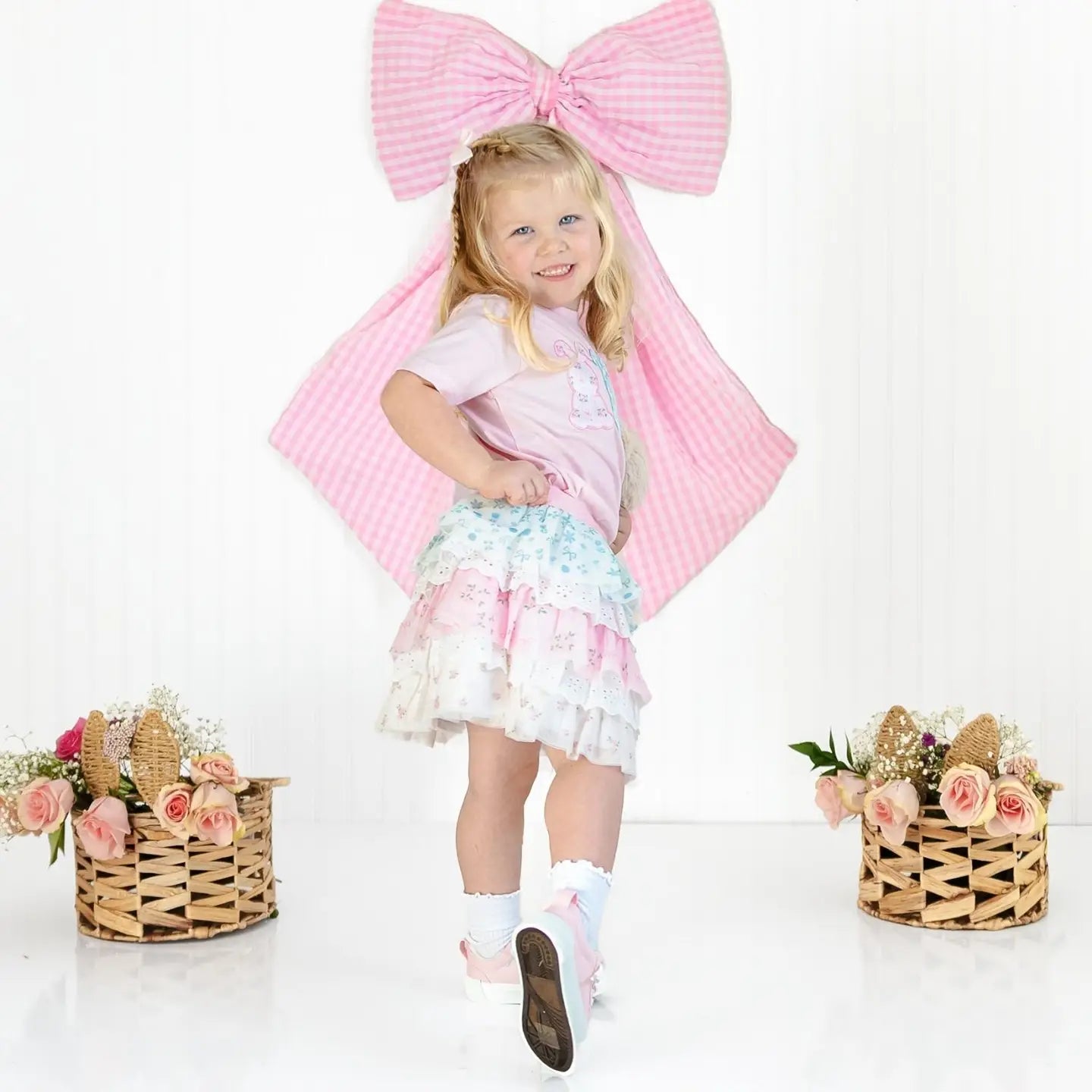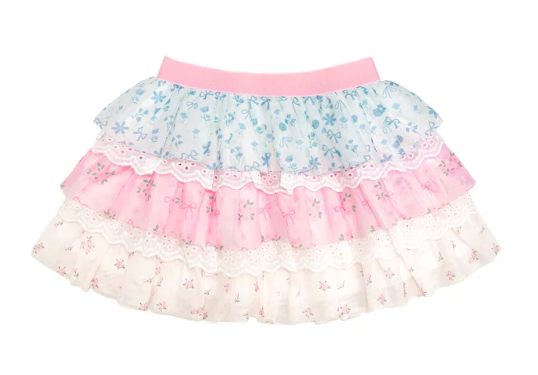 This delightful girls' tiered tutu skirt is a twirl-worthy dream, blending whimsical floral prints and sweet lacy ruffles perfect for dress-up adventures.