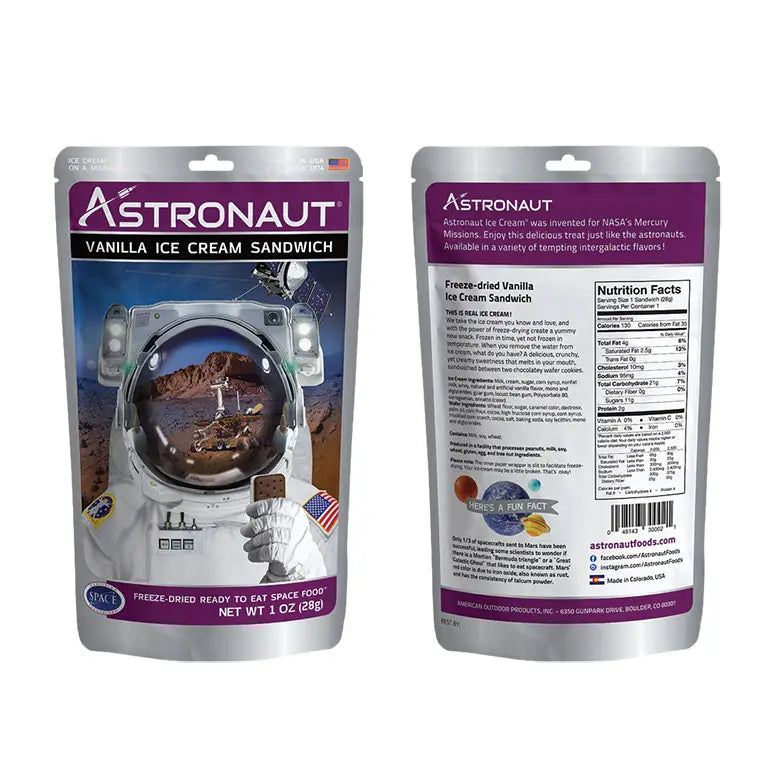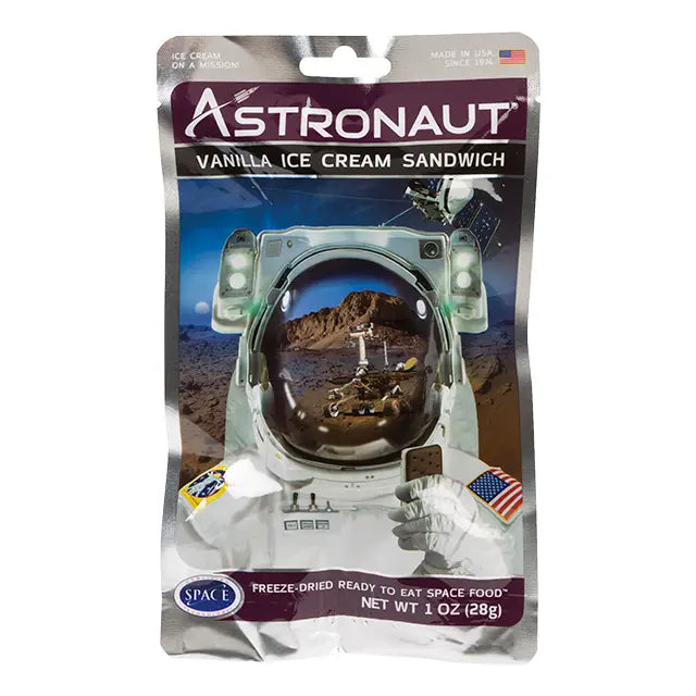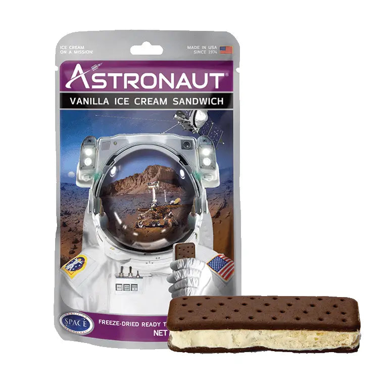 The out of this world, best-selling ice cream snack from Astronaut Foods! Made with real ice cream and freeze-dried, this astronaut vanilla ice cream sandwich is ready to eat right out of the packet. Take ice cream anywhere, anytime without it melting or making a mess. • One serving per packet • Can be stored for up to 3 years • 1 oz.