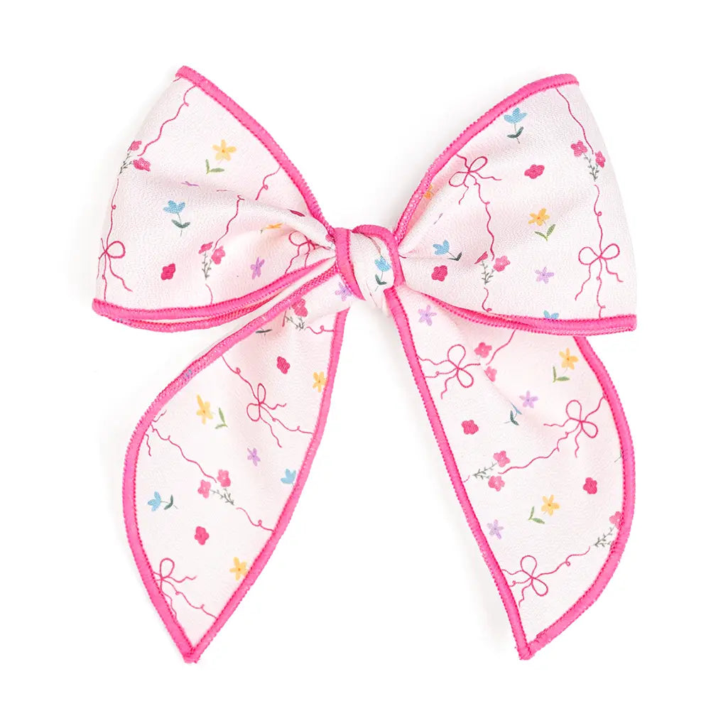 This soft fabric bow clip features a delicate pastel floral print, perfect for adding a sweet, gentle touch to any hairstyle. Features: Soft pink bow with a multicolor floral and bow print pattern