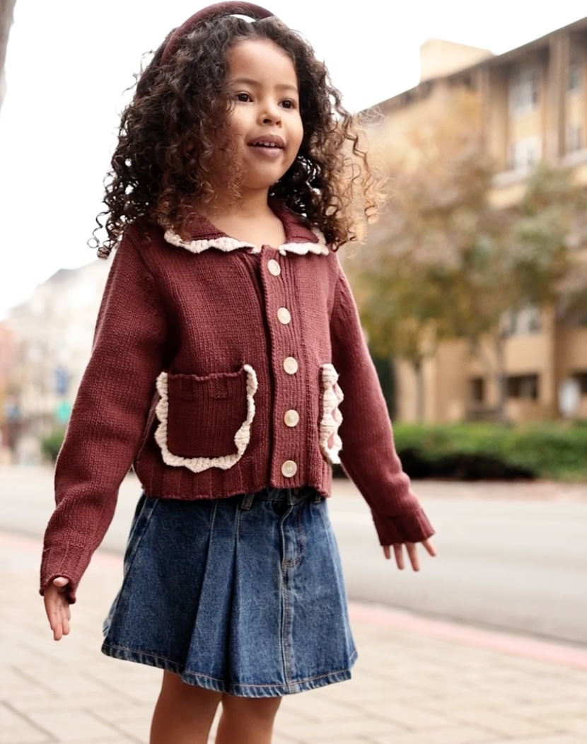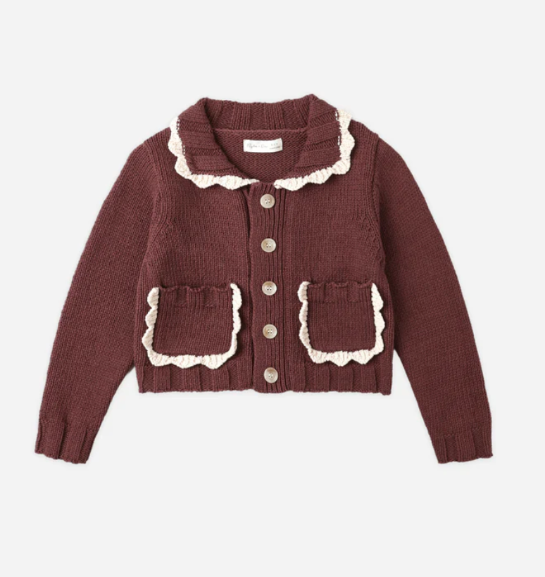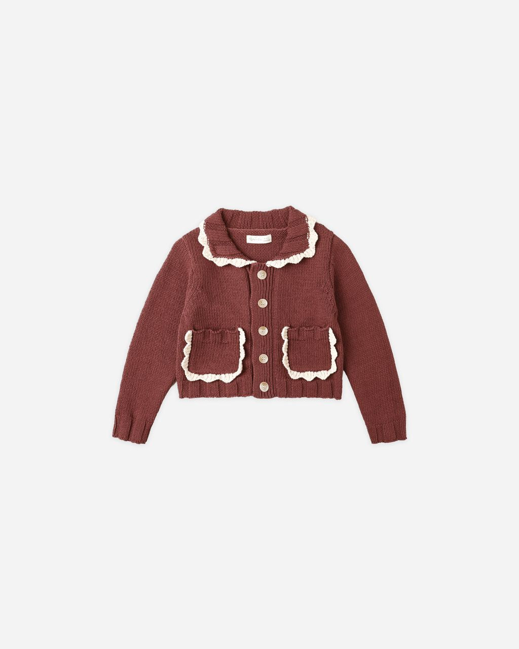 Our Collared Cardigan features contrast crochet scallop detail on the pockets and collar for added charm and class.