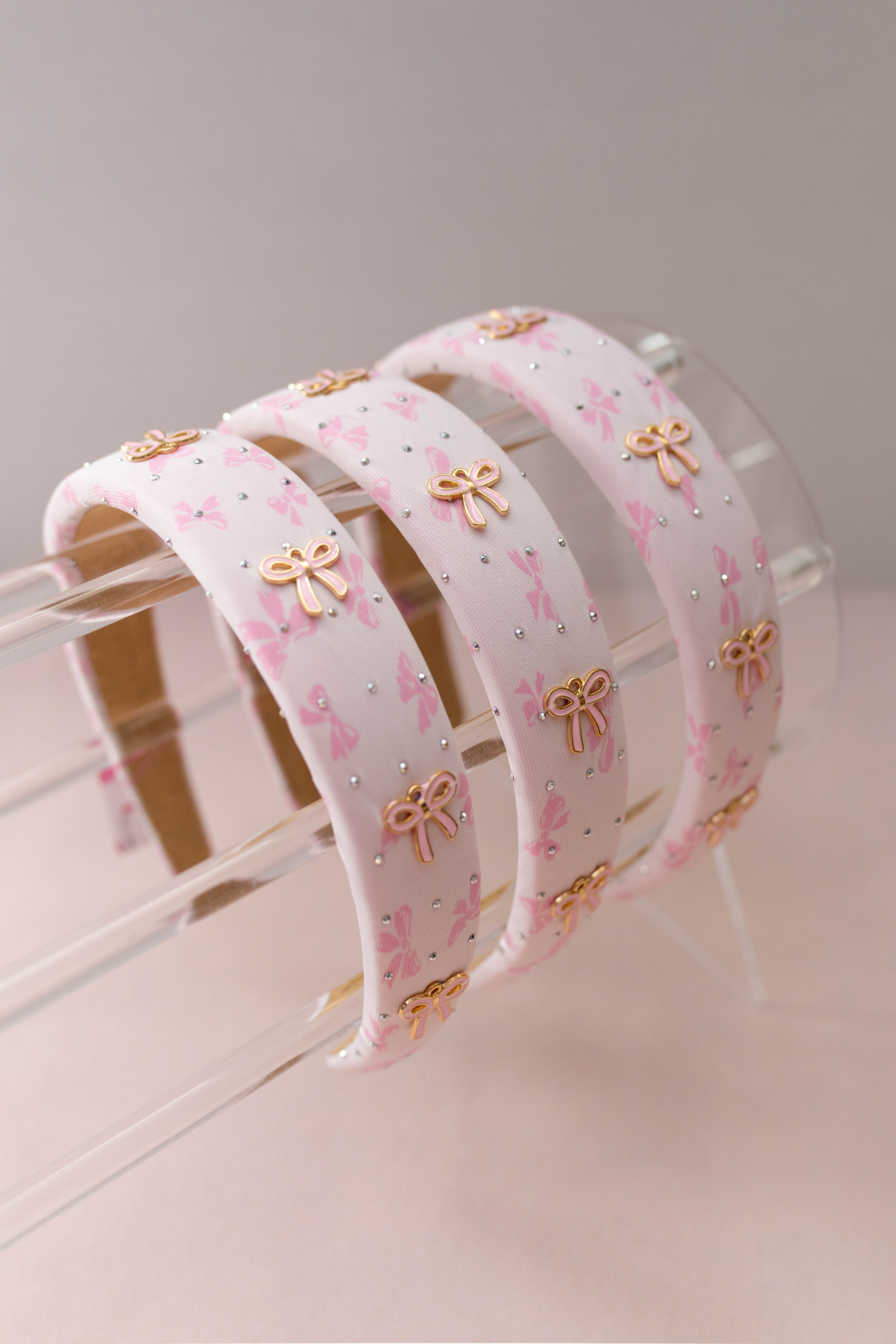 The girls are going to love this pink bow printed padded headband by Bari Lynn. The pink bow print is so pretty and then she went over the top and added pink bow charms and sprinkled rhinestones too. This is so on trend and is sure to be worn with so many of her favorite dresses and outfits this season.