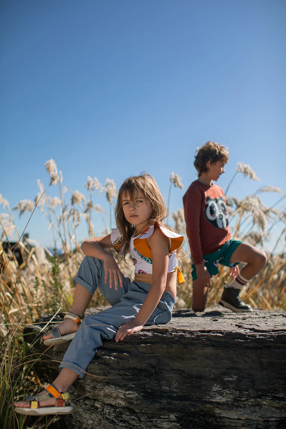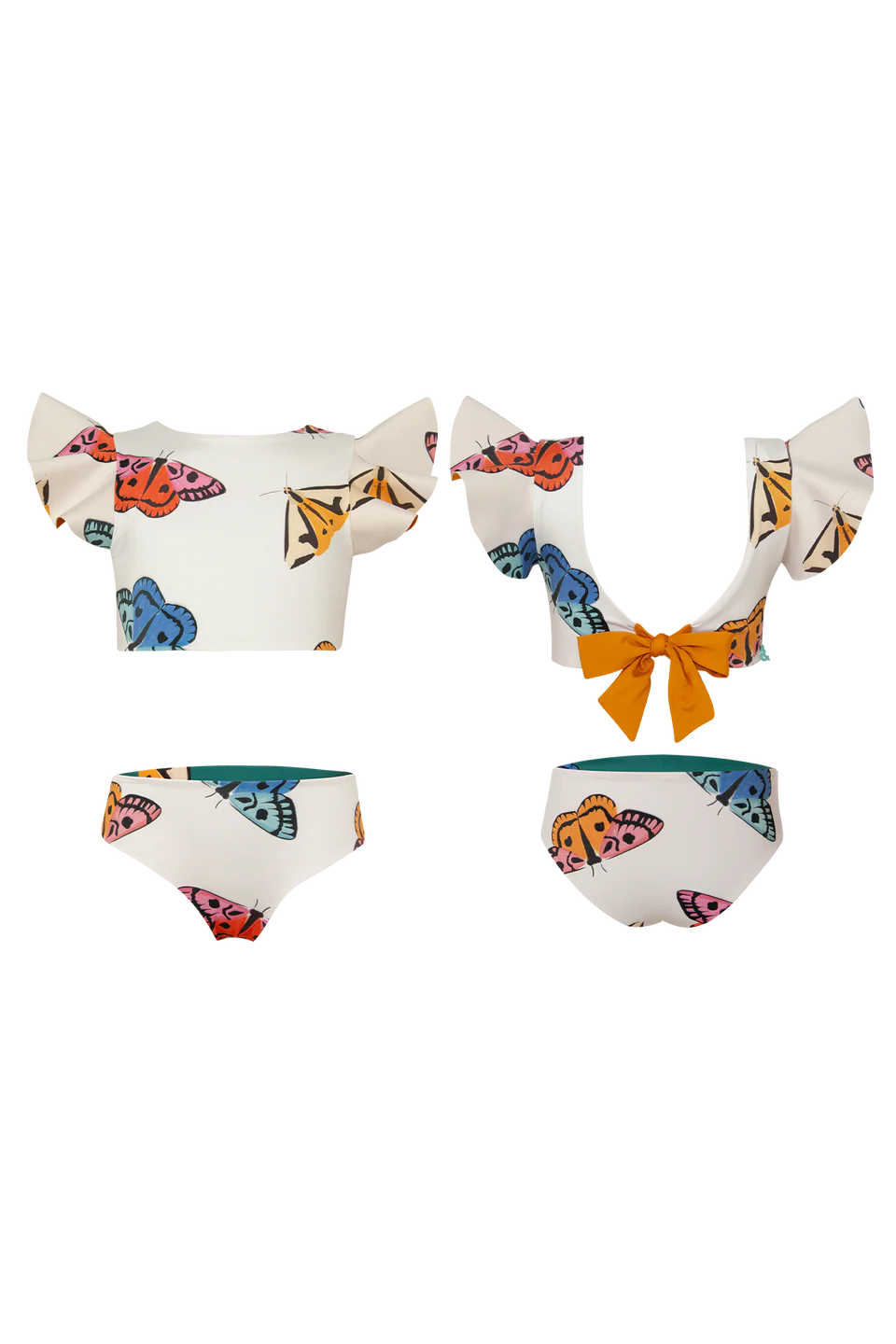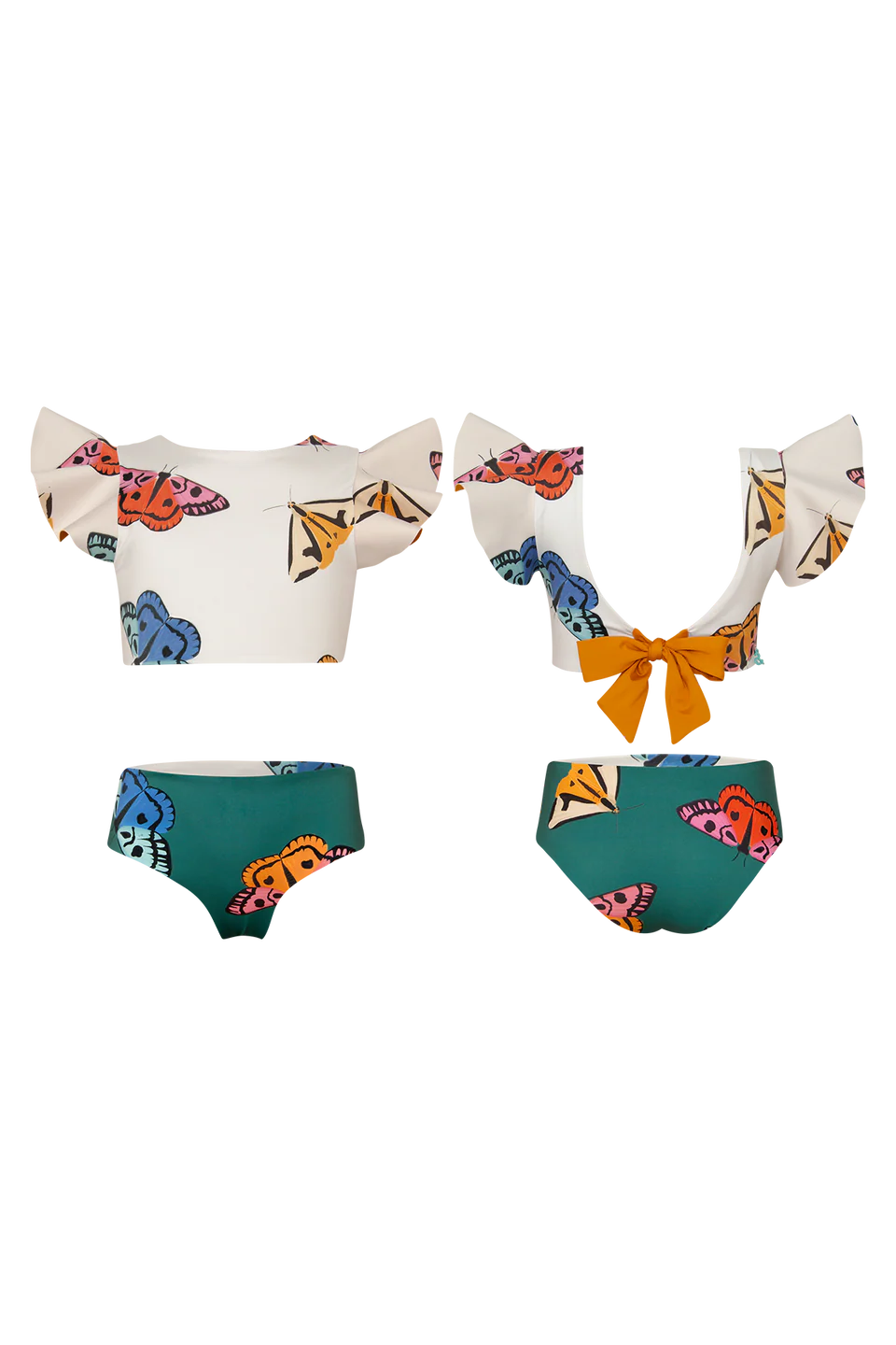 POLILLA ARCOIRIS CRUDO - DAYANA BIKINI. Introducing the bikini version of our best-selling Dayana one-piece, featuring bold flounced sleeves, tie-back closure, and reversible bottoms. Made in Colombia.