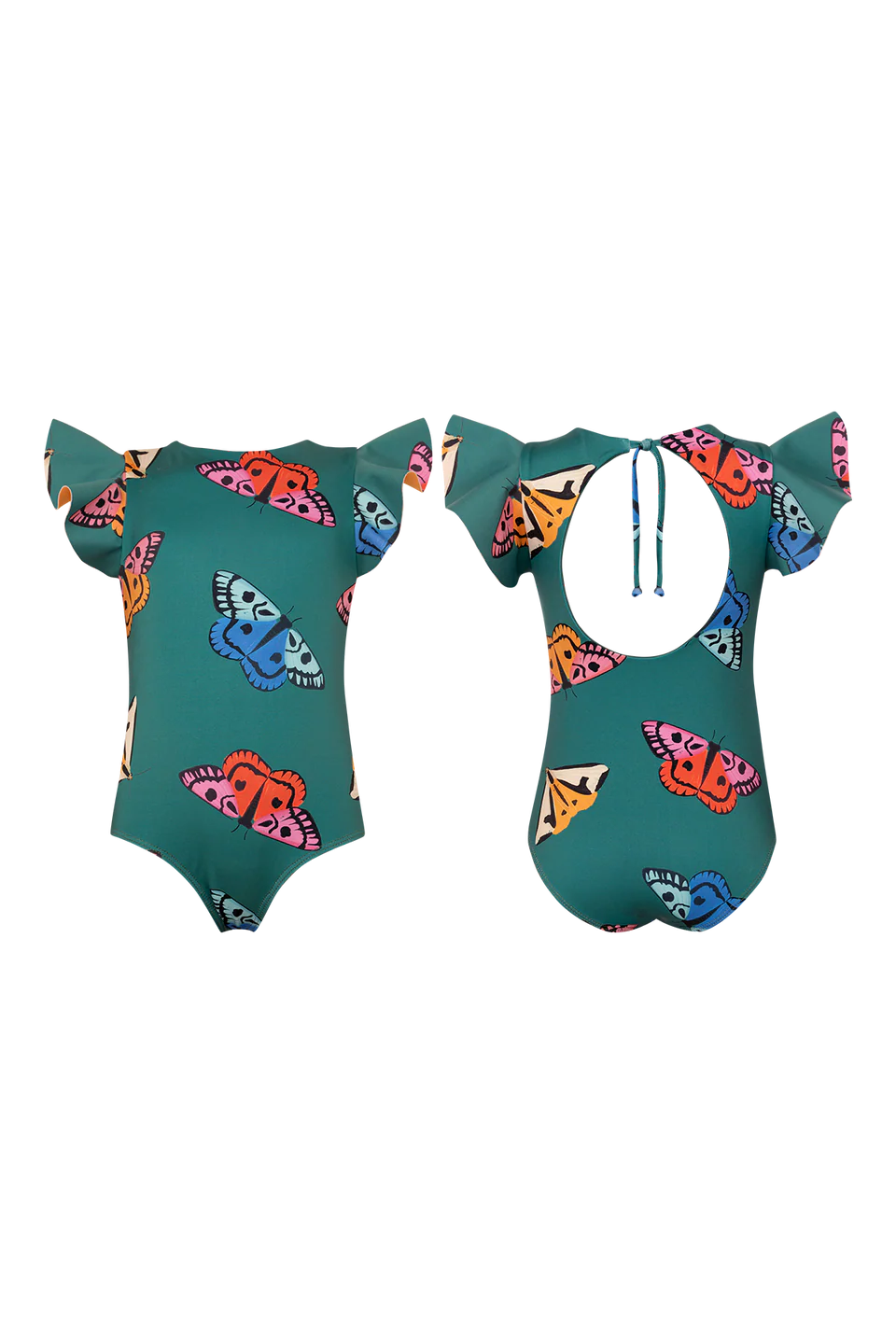 One-piece swimsuit with eye catching flounce sleeves! Open back with a ribbon bow. Made of quick-drying UPF50+ fabric. Made in Colombia