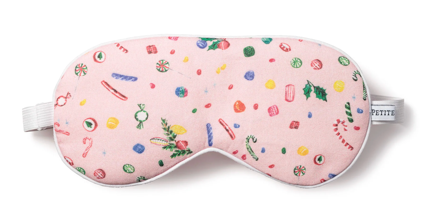 Nostalgic holiday sweets cover this eye mask, starting the festive season with a sugar rush. Feel transported to holidays past with illustrated ribbon candies, pinwheels, and peppermints straight out of a vintage candy dish.