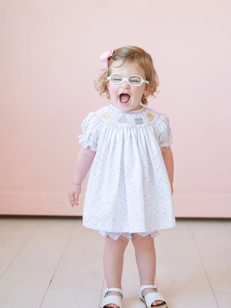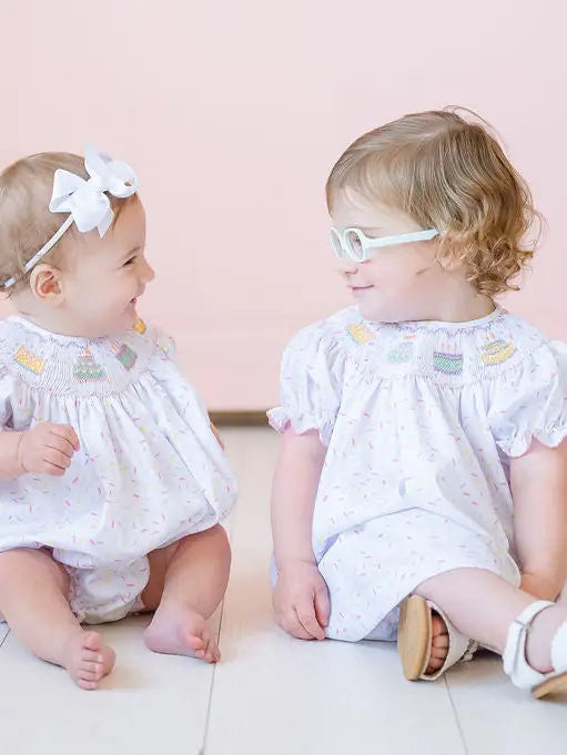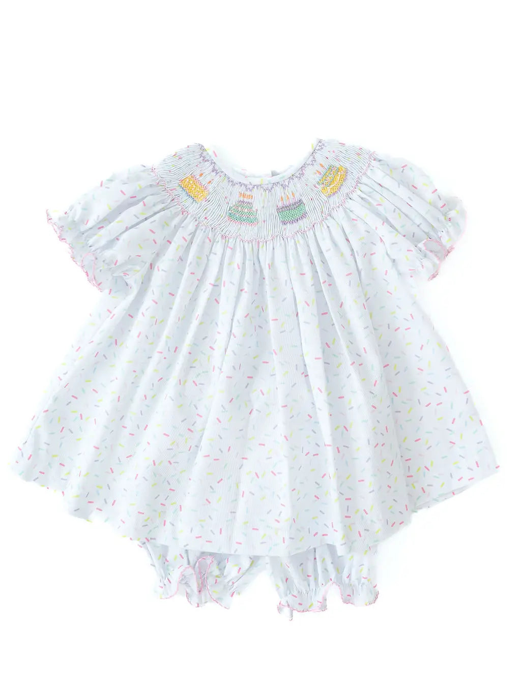 Dress your birthday girl in adorable charm with our Smocked Sprinkle Birthday Cake Bloomer Set, featuring an all-over sprinkle pattern and smocked bodice with sweet birthday cakes.