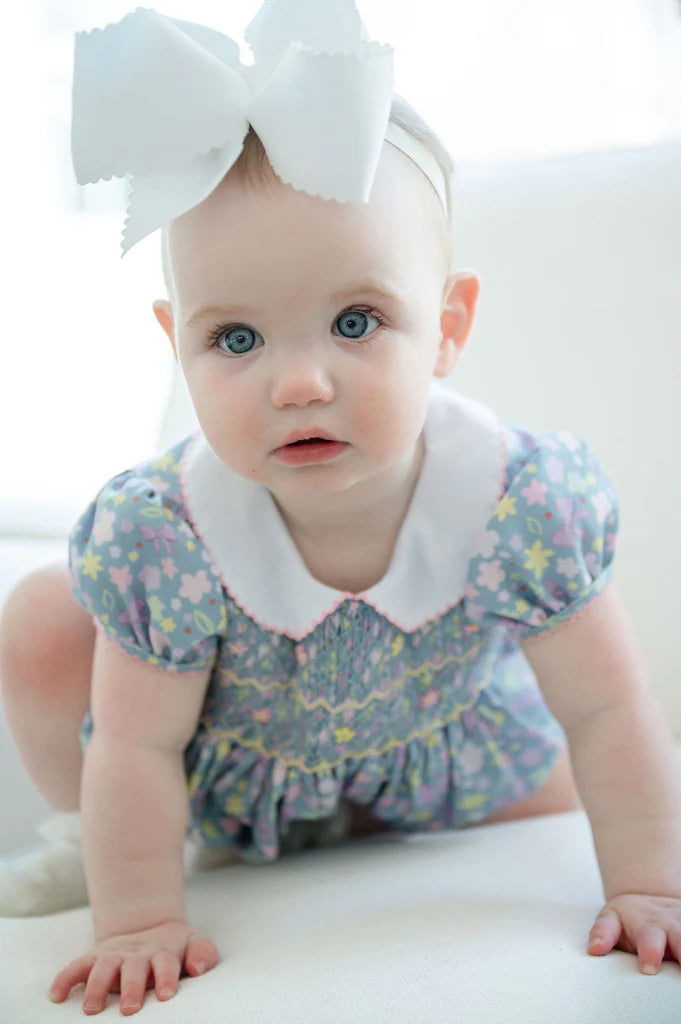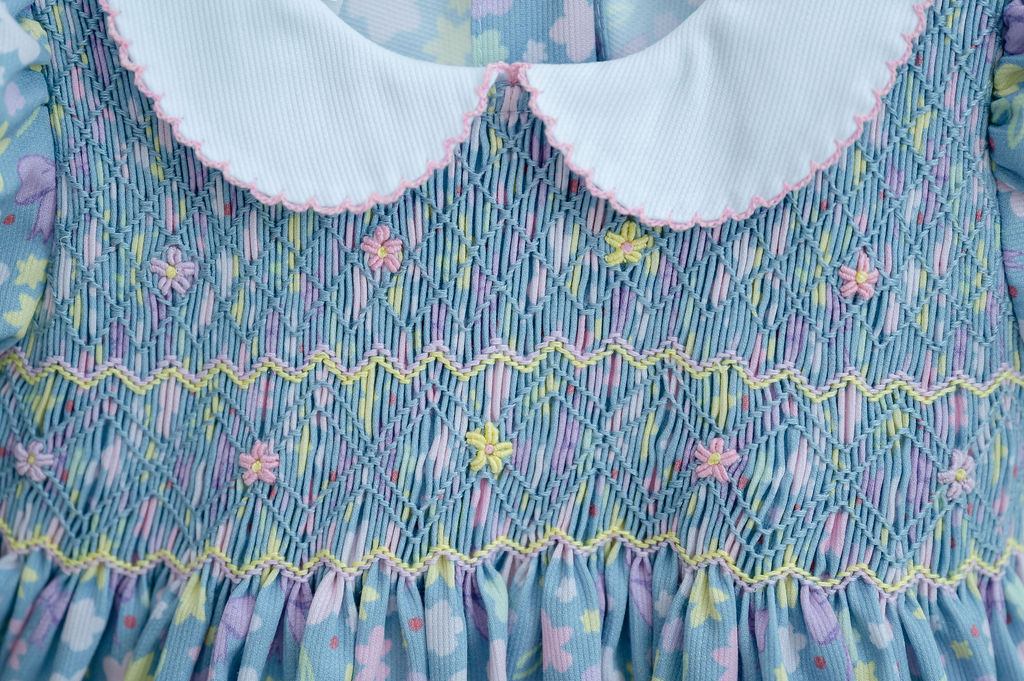 The Smocked Flower and Bows Bubble is a sweet, heirloom-quality outfit for babies and toddlers, perfect for springtime celebrations, special events, Easter, and tea parties. Made from a soft 65% Polyester / 35% Cotton blend, this charming bubble features a blue fabric with pastel flowers and tiny bows in shades of lavender, pink, yellow, mint, and white. The bodice is finished with traditional hand-style smocking and a white Peter Pan collar with pink picot edging, creating a timeless, classic look.