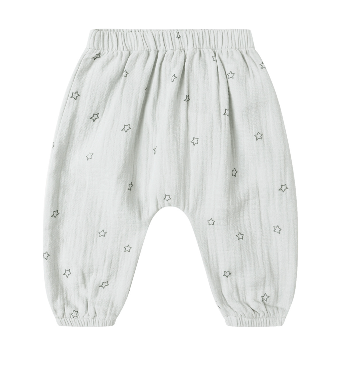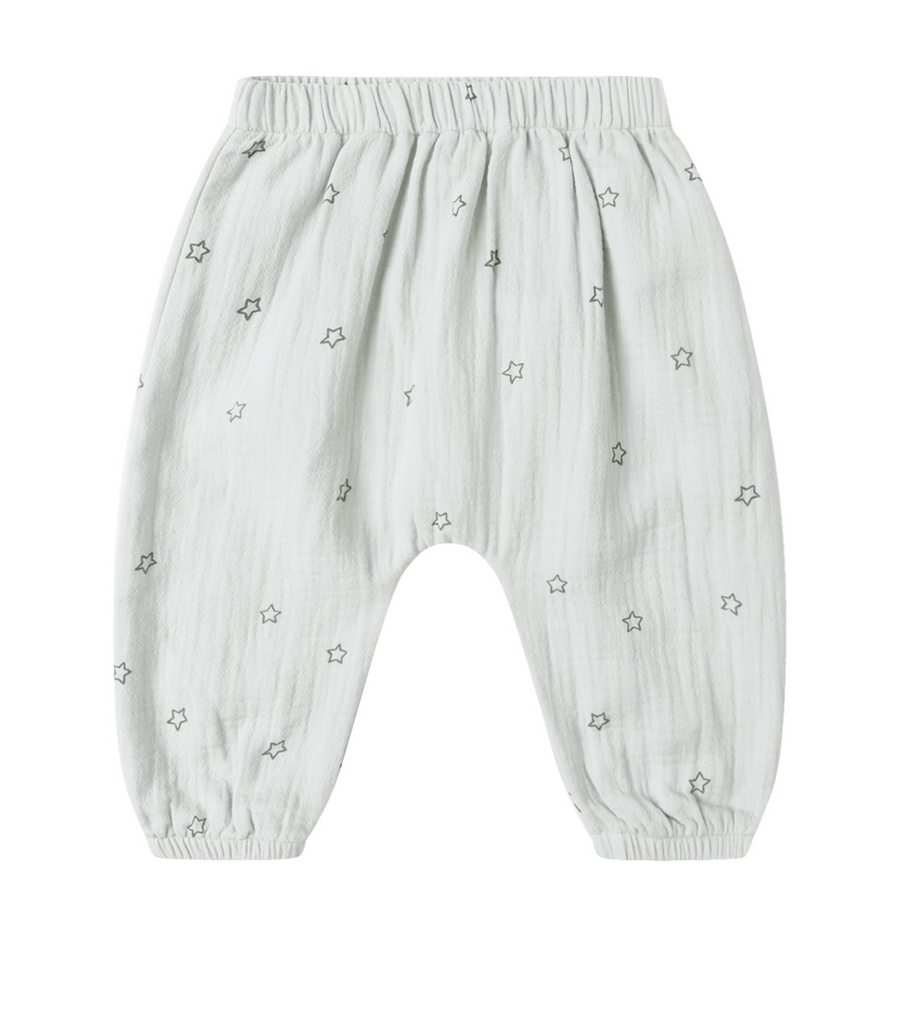 Woven pants with an elastic waistband and leg openings, designed with a dropped crotch for a relaxed, easy fit.