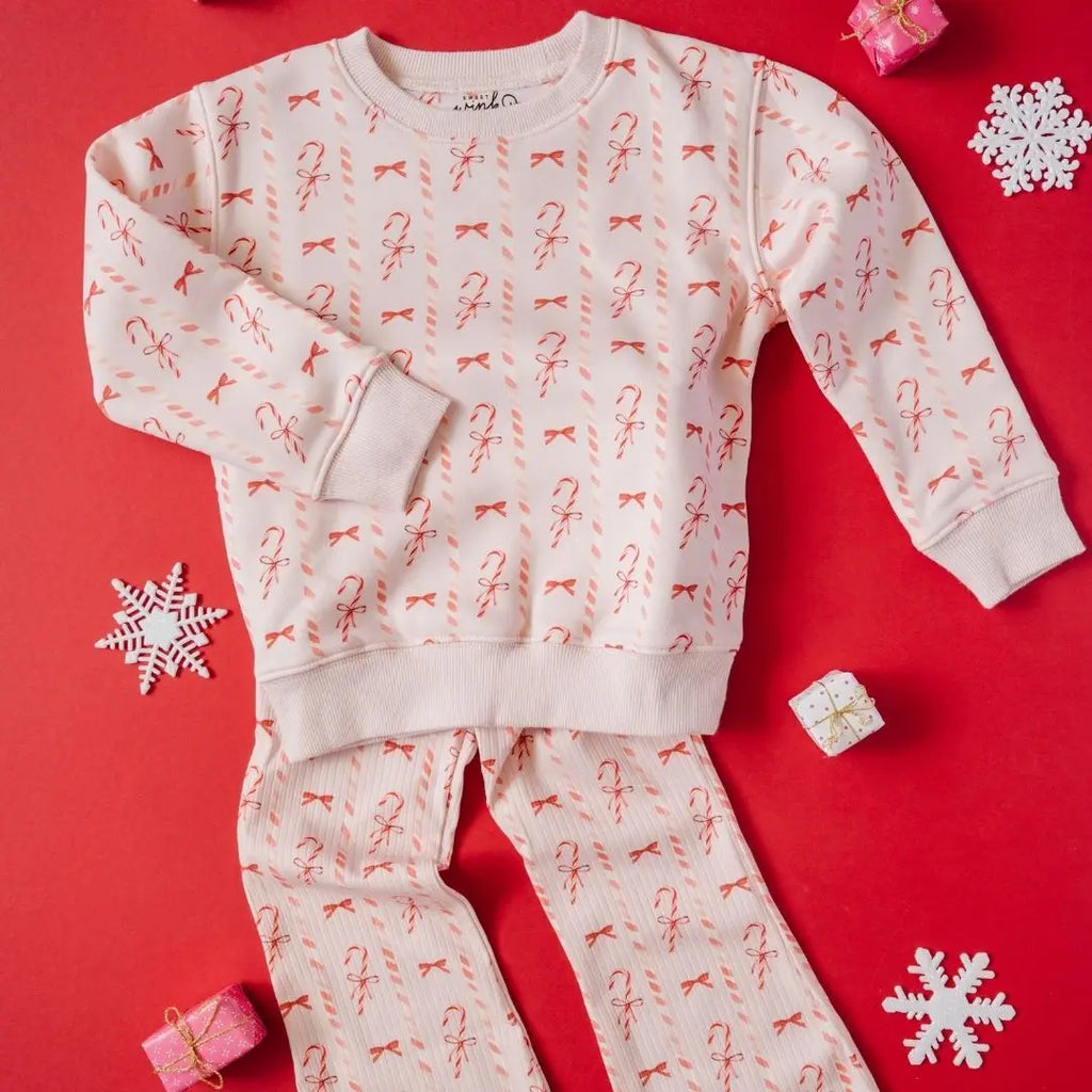 The Candy Cane Trellis Christmas set is a fun and festive sweatshirt for celebrating Christmas! Features: Color: Ballet Pink *Graphic Color: Multicolor *Material: 60% Cotton/40% Polyester *Features: Tagless inside neck label for an itch-free wear *Fit: Toddler Unisex; True to Size *Care: Machine wash cold inside out, only non-chlorine bleach, tumble dry low, do not iron on decoration, do not dry clean