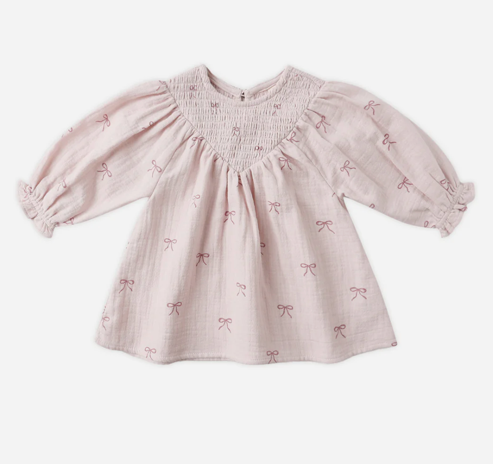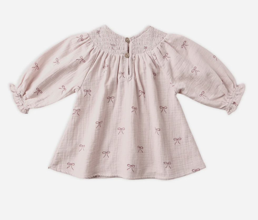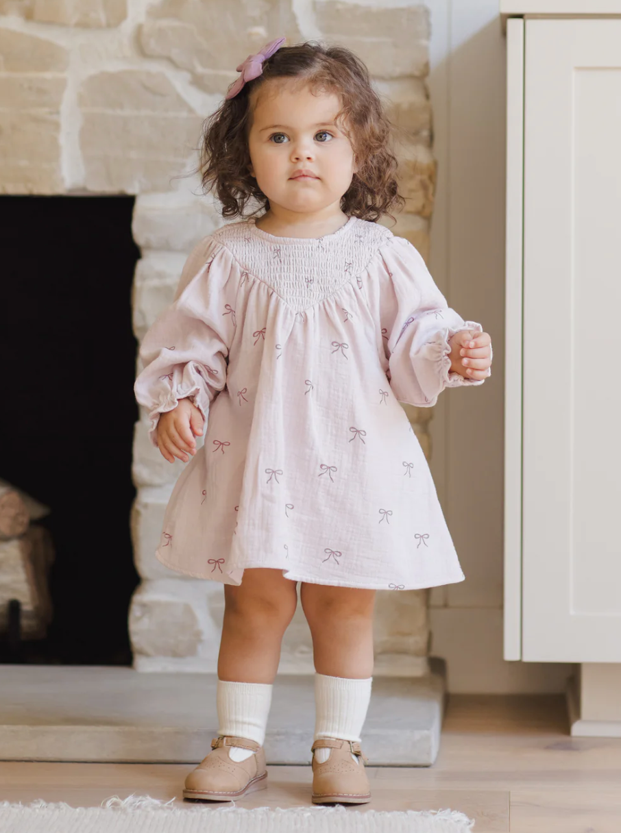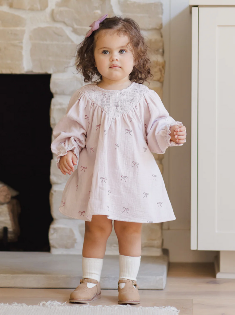 This sweet long sleeve dress features a v-shaped smocked neckline, ruffle sleeves, and a button back closure for easy changes. Coordinating bloomers included with all sizes.