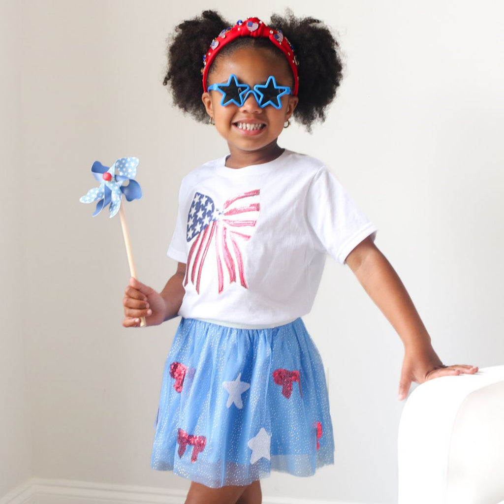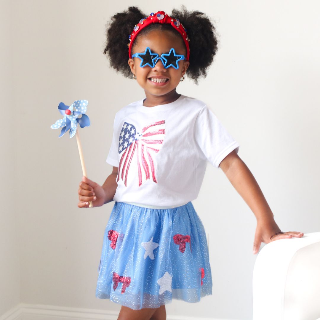 The Patriotic Sequin Bow Patch Short Sleeve T-Shirt is a fun and festive t-shirt for kids celebrating the 4th of July or to show patriotic spirit any day! Features: * Shirt Color: White * Patch Color: Red, white and blue sequins with white felt outline * Material: 100% Cotton * Features: Tagless inside neck label for an itch-free wear * Fit: Toddler Unisex; True to Size * Care: Machine washable, wash inside out, lay flat to dry Each t-shirt is hand pressed with love in our hometown warehouse.