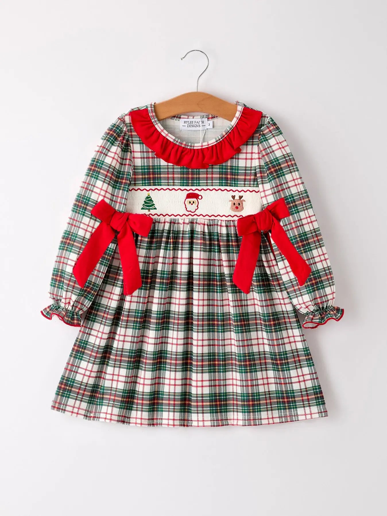 Dress your little one in festive charm with this Christmas Embroidery Smocking Bow Plaid Girls Dress. Featuring delicate embroidery and a classic plaid pattern, it combines timeless style with holiday spirit. The smocked bodice ensures a comfortable fit, while the bow adds a sweet finishing touch. Perfect for holiday gatherings and photos, this dress makes every moment memorable.