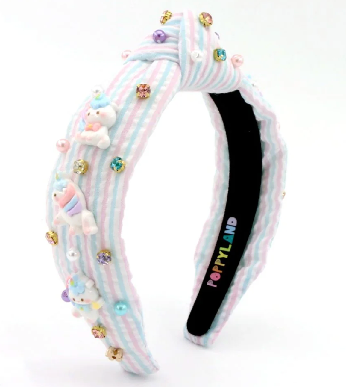 Elevate your everyday style with the Seersucker Unicorn headband from Poppyland, a kingdom of cuteness. Adorned this colorful headband is perfect for any occasion. It seamlessly combines the charm of white pearls and rhinestones for an added touch of elegance. Ideal for those who love to infuse their outfits with a touch of whimsy, Seersucker Unicorn promises to be the standout accessory in your collection. Embrace the playful yet sophisticated design and let your personality shine with every wear