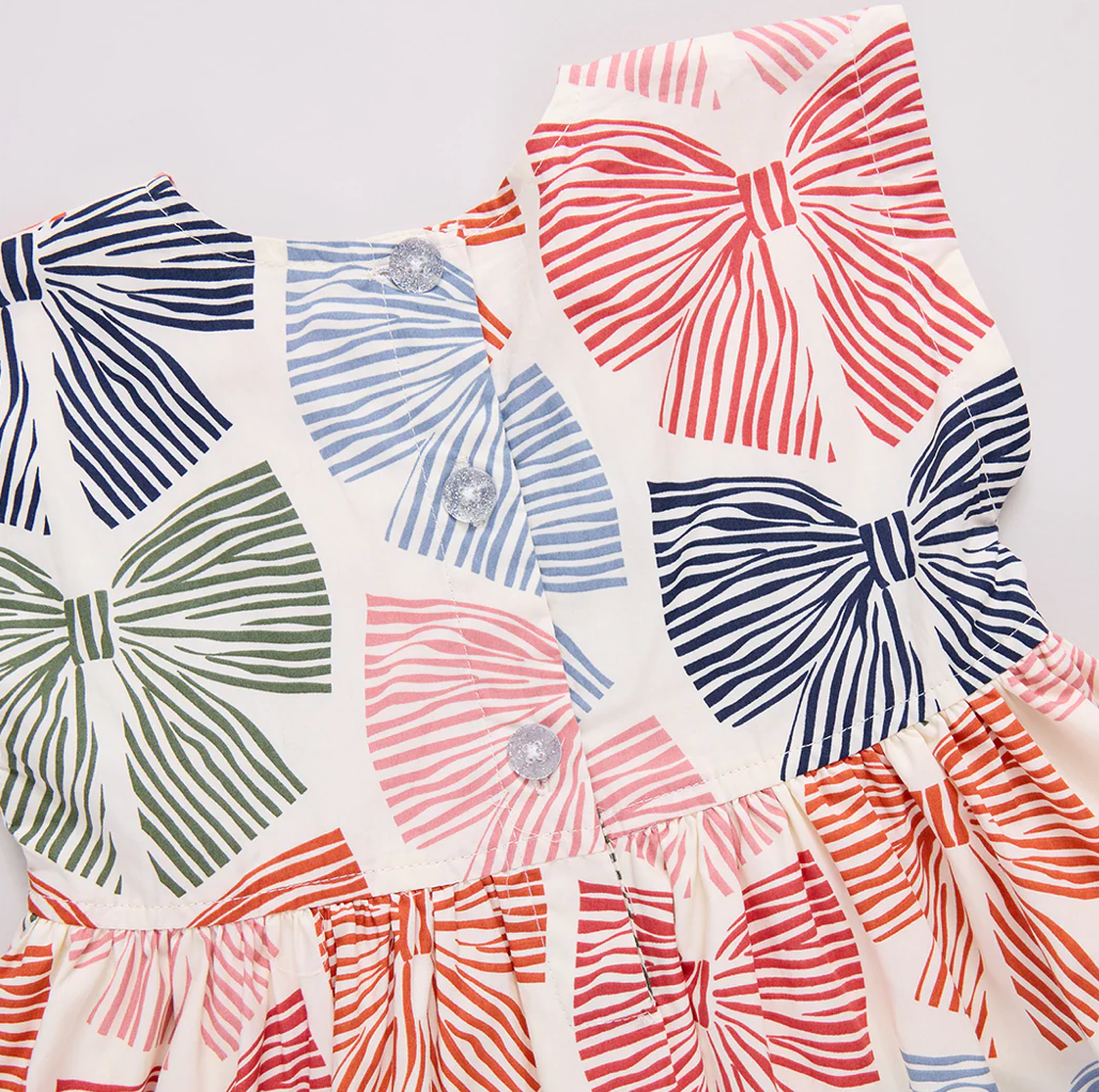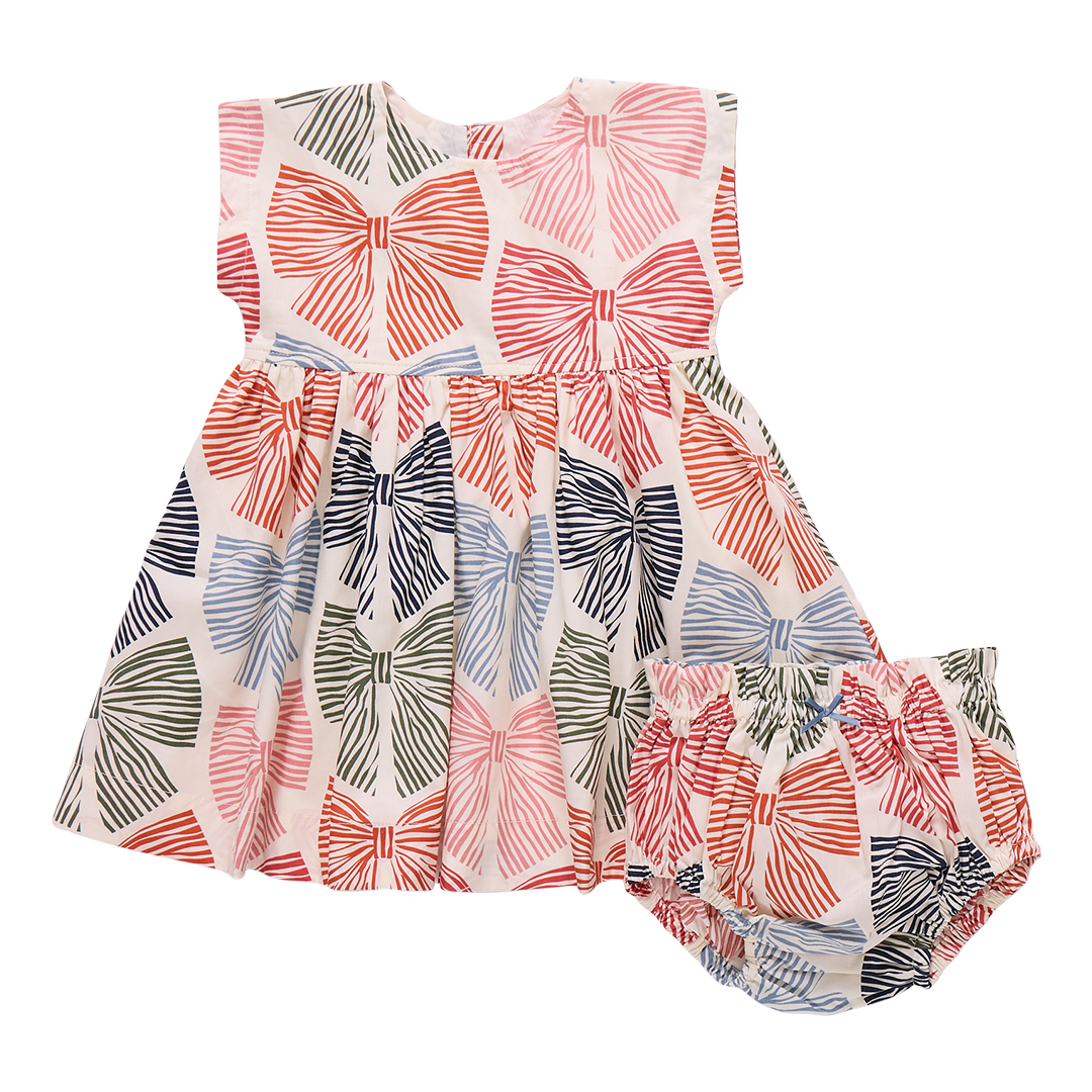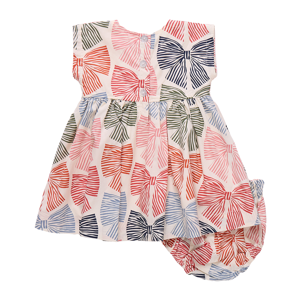 Bounty Of Bows! Our sweetly sophisticated Baby Girls Adaline Dress Set in Multi Striped Bows features a fully gathered skirt, crisp cap sleeve and silver glitter buttons at the back.