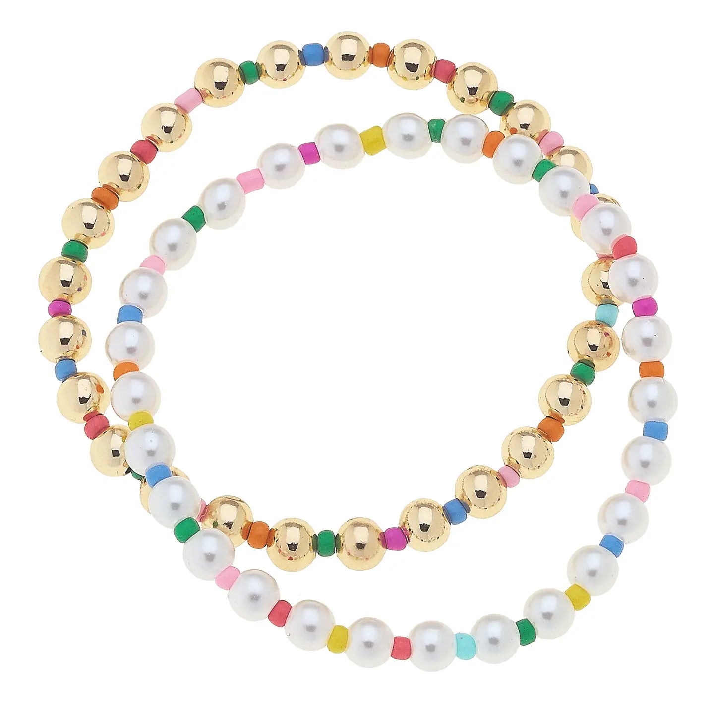 The Luna Pearl & Rainbow Ball Bead Children’s Stretch Bracelet Set features a duo of stretch bracelets adorned with pearls and rainbow-colored ball beads. These bracelets are perfect for adding a burst of color and fun to any young child’s wardrobe. DETAILS Base Metal with Shiny Gold Plating Stretch