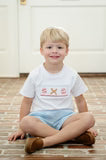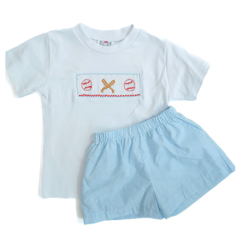 The Smocked Baseball T-Shirt and Shorts Set is a classic favorite for little boys ready to celebrate America’s favorite pastime in style. The white 100% cotton T-shirt features a hand-smocked panel adorned with baseballs and baseball bats, paired with soft blue pinstripe shorts made from a 65% Polyester / 35% Cotton blend. Designed for boys ages 12M to 8, this set is perfect for game days, family outings, or Father’s Day celebrations.