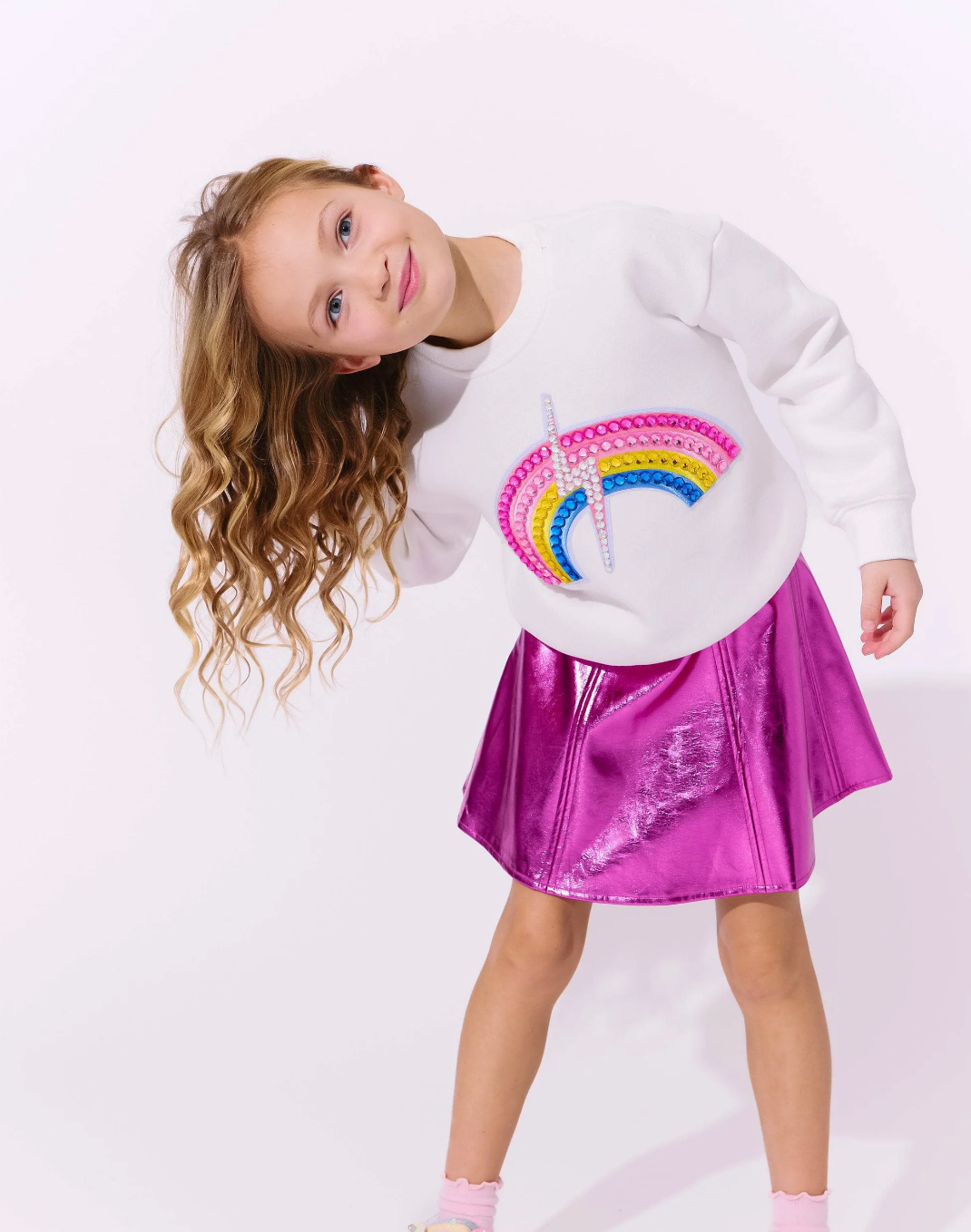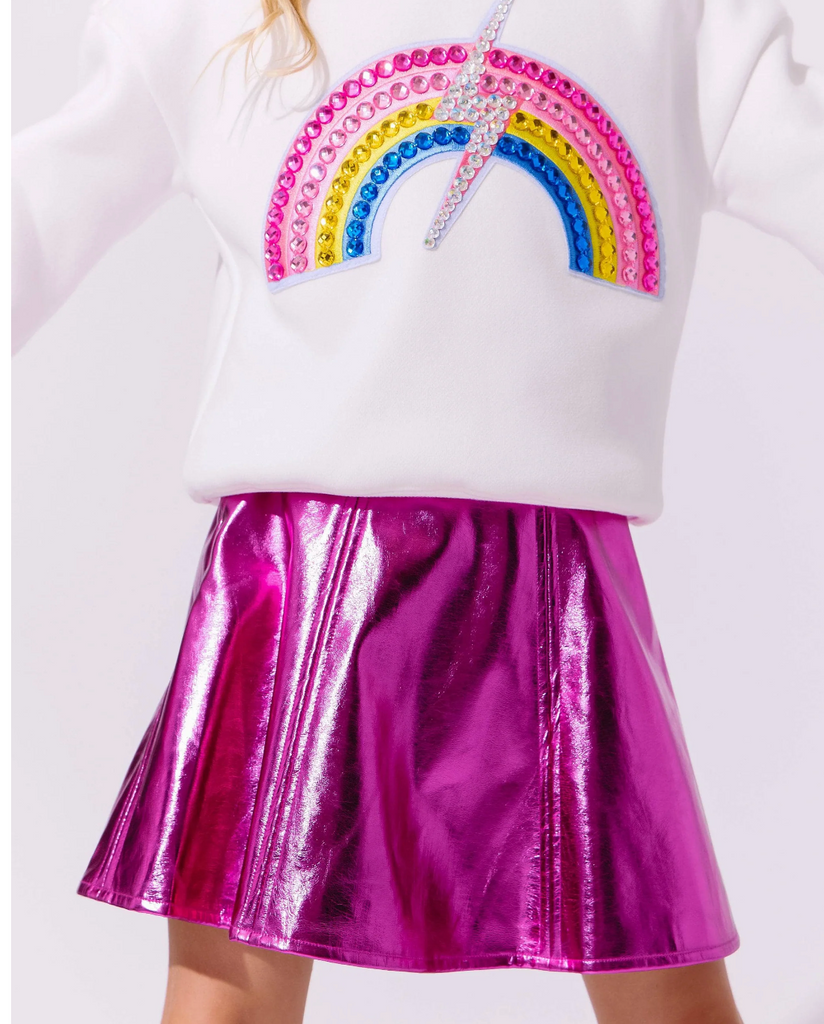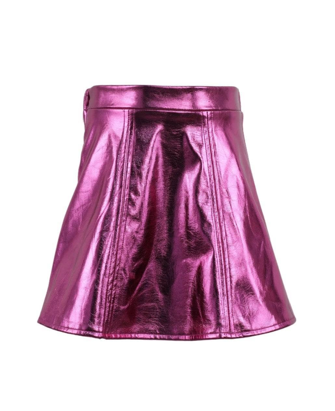 • Bold and vibrant hot pink metallic skirt with a flared silhouette for a fun, statement-making look.