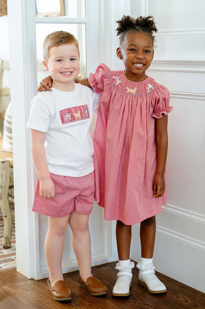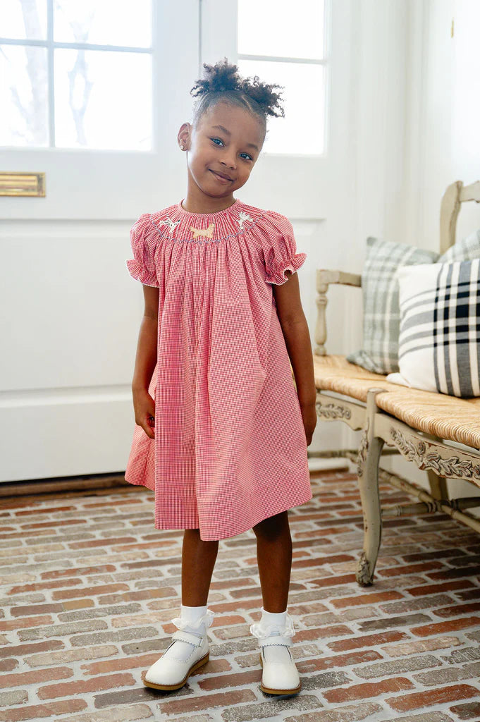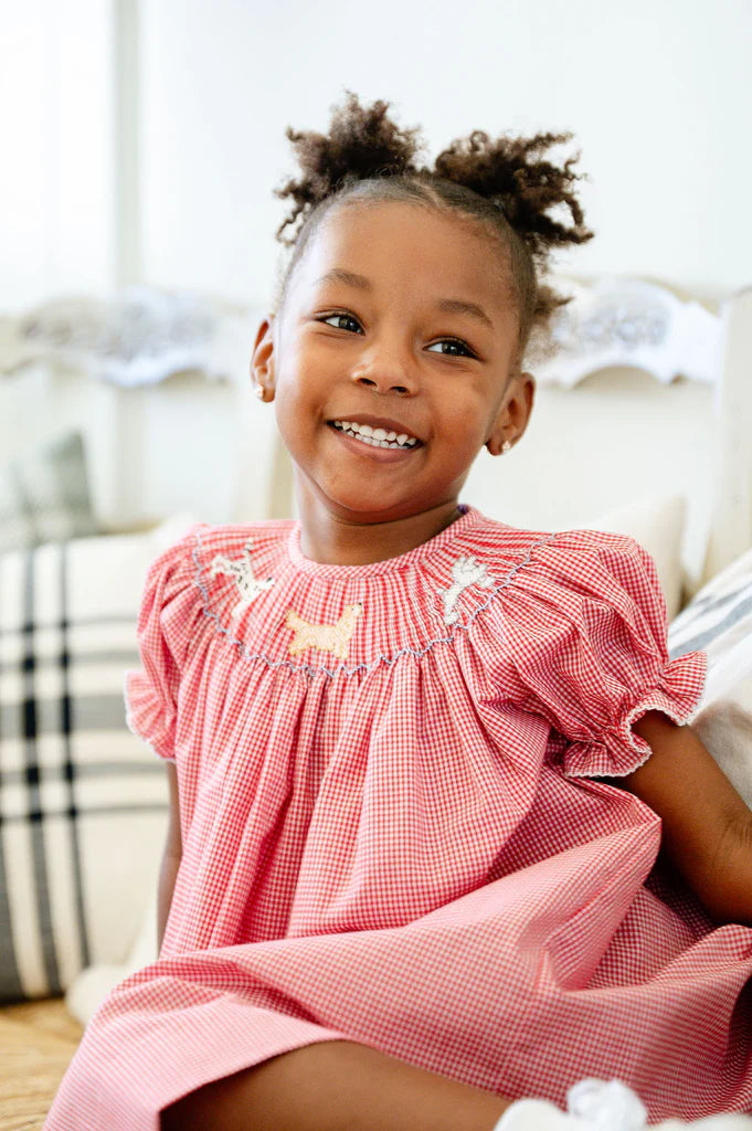 The Smocked Puppy Dress is a timeless style for girls celebrating special moments and everyday joy. Made from a soft 45% Polyester / 55% Cotton blend, this red gingham dress features three hand-smocked puppies. Available in sizes 2T through 6Y, it offers a classic Southern-inspired look perfect for parties, family gatherings, and seasonal celebrations.