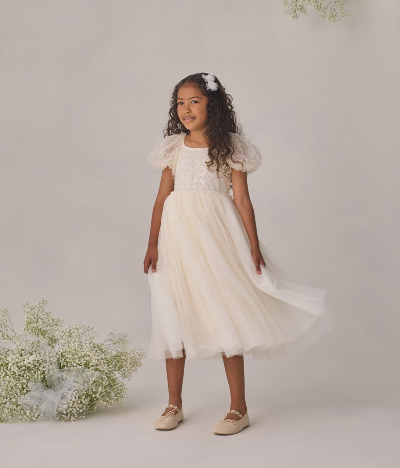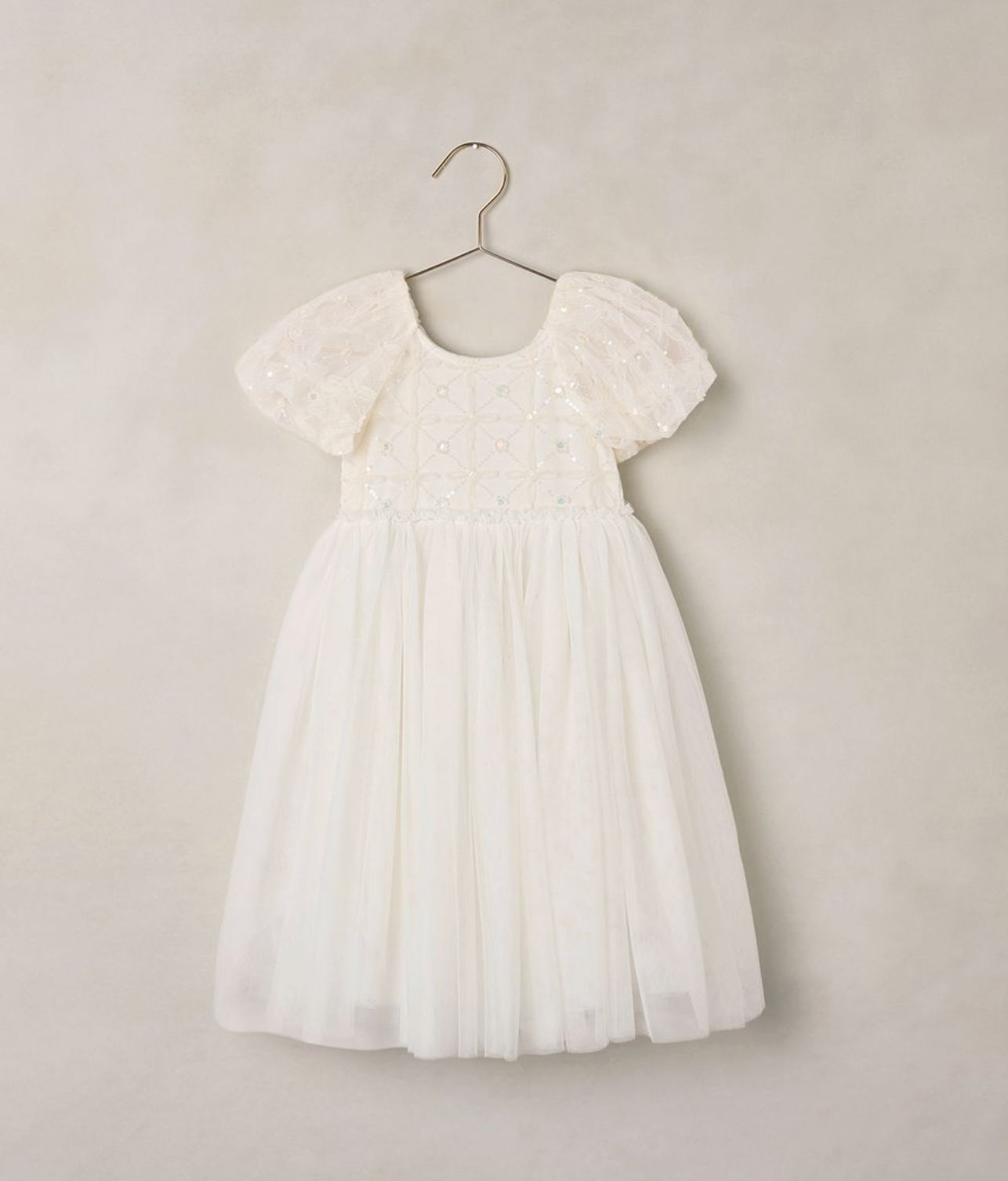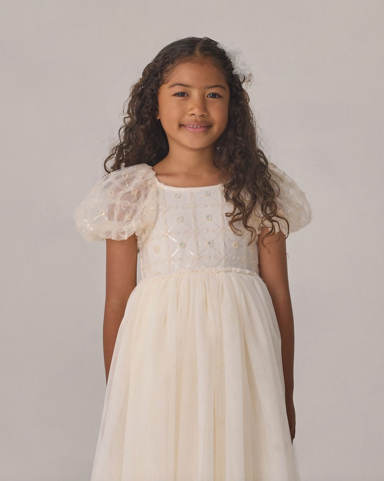 The Dorothy Dress features a delicately embroidered bodice with subtle sequins, voluminous puff sleeves in airy tulle, and a softly gathered skirt that creates a dreamy silhouette.