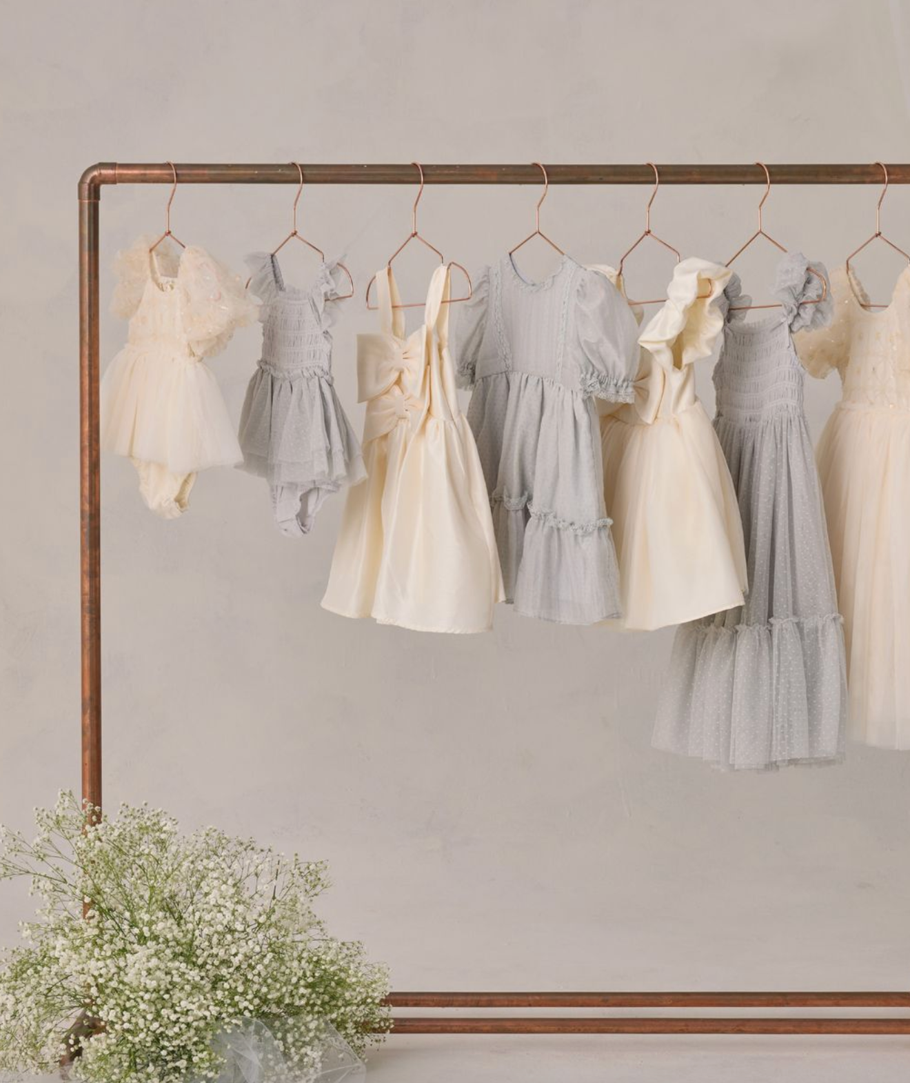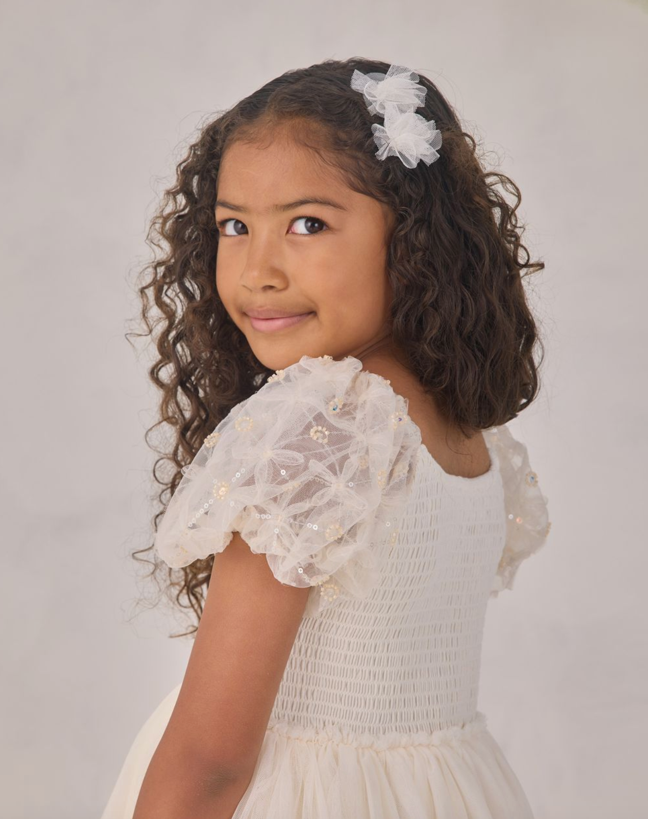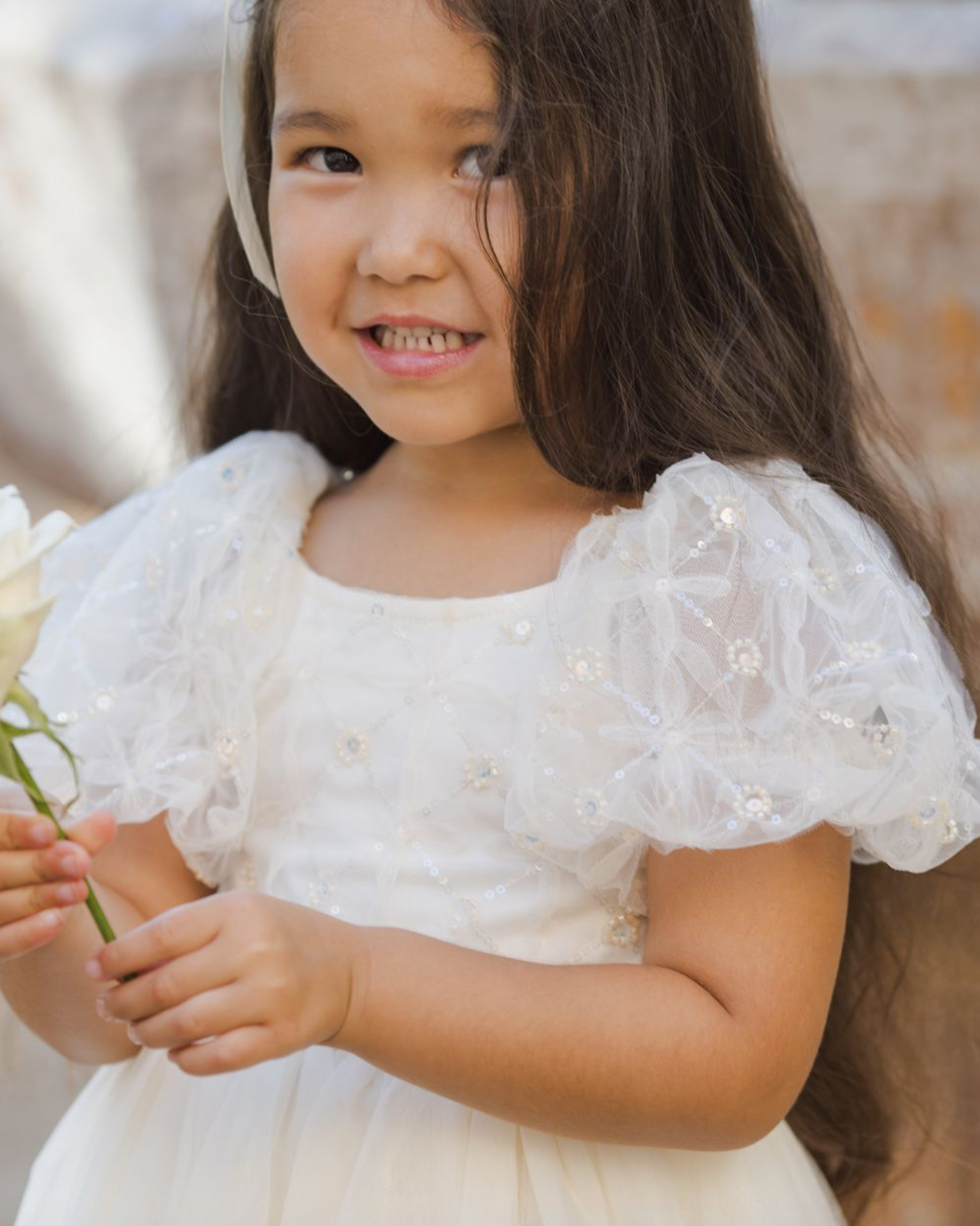 The Dorothy Dress features a delicately embroidered bodice with subtle sequins, voluminous puff sleeves in airy tulle, and a softly gathered skirt that creates a dreamy silhouette.