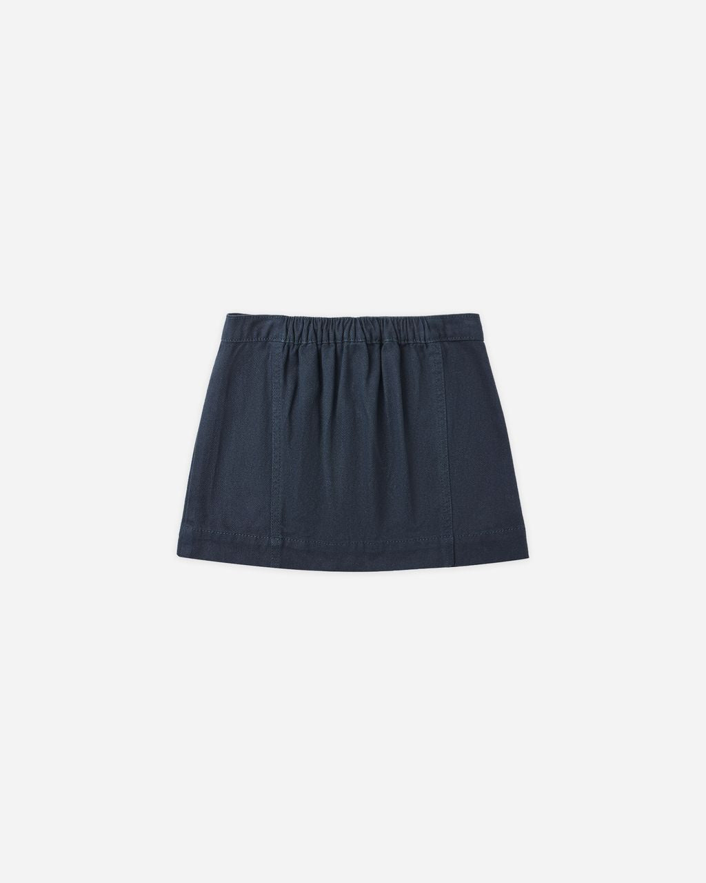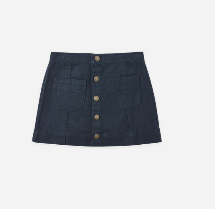 This versatile denim skirt channels preppy charm with antique brass buttons and functional front pockets.