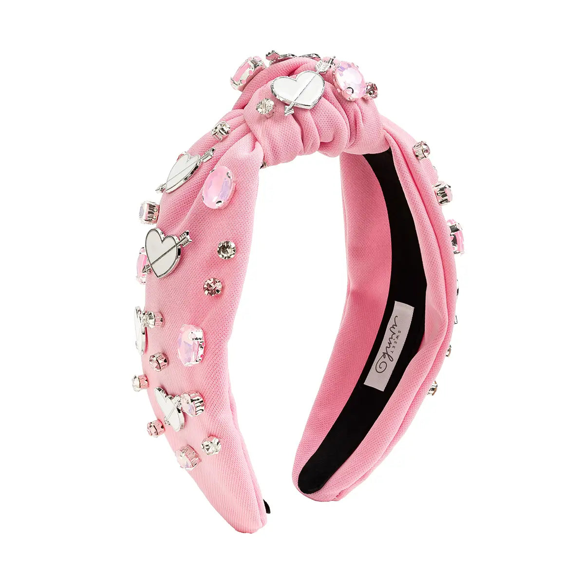 Add a touch of sparkle to any outfit with this pink gemstone headband, adorned with shimmering rhinestones and silver heart charms for a playful look. Perfect for Valentine’s Day or adding a bit of glam to everyday style. Features: *Ballet pink fabric with hearts and rhinestone embellishments *Satin lined headband *Ages 7+ (including adults) Pair this headband with a matching small size headband for the perfect mommy & me moment!