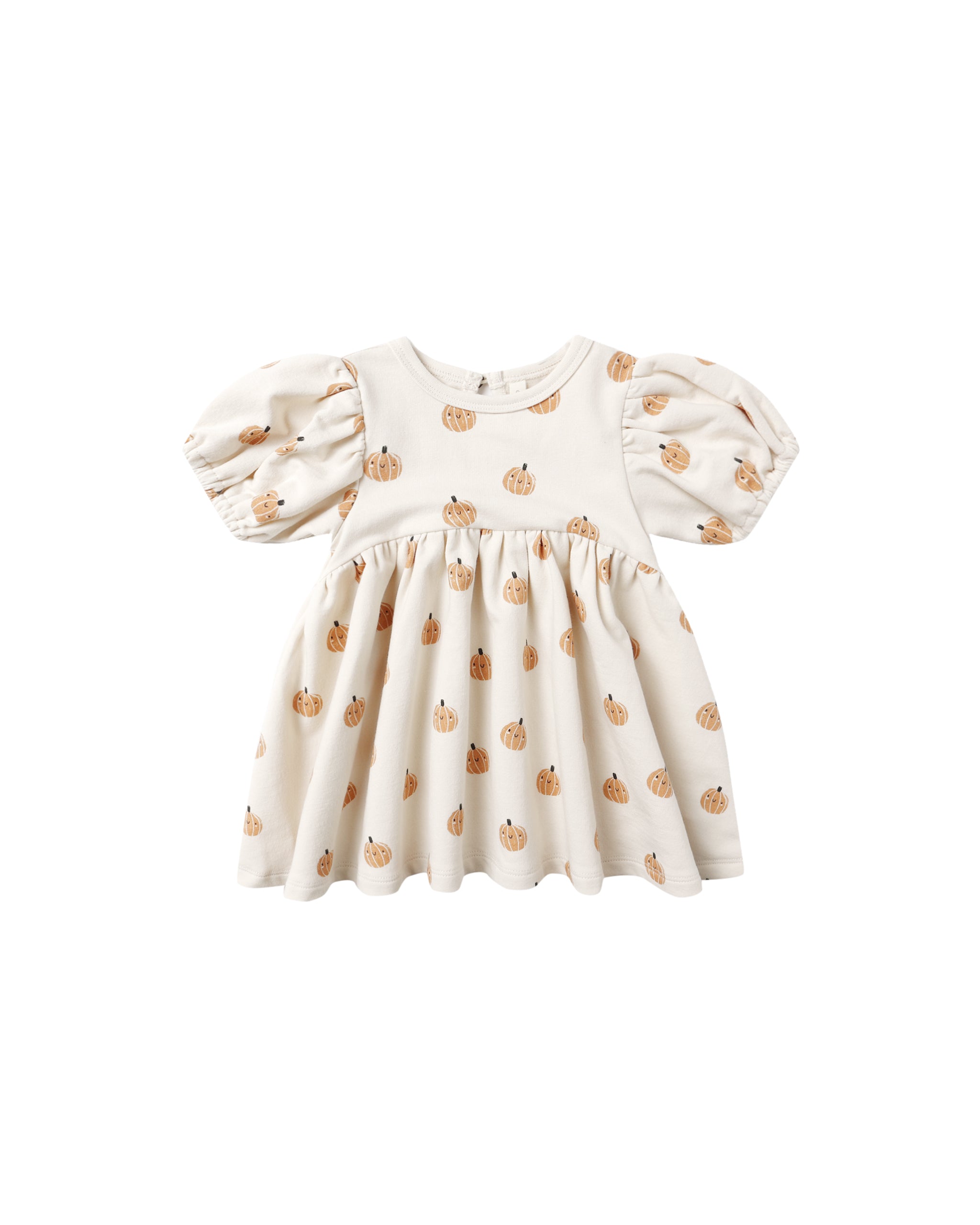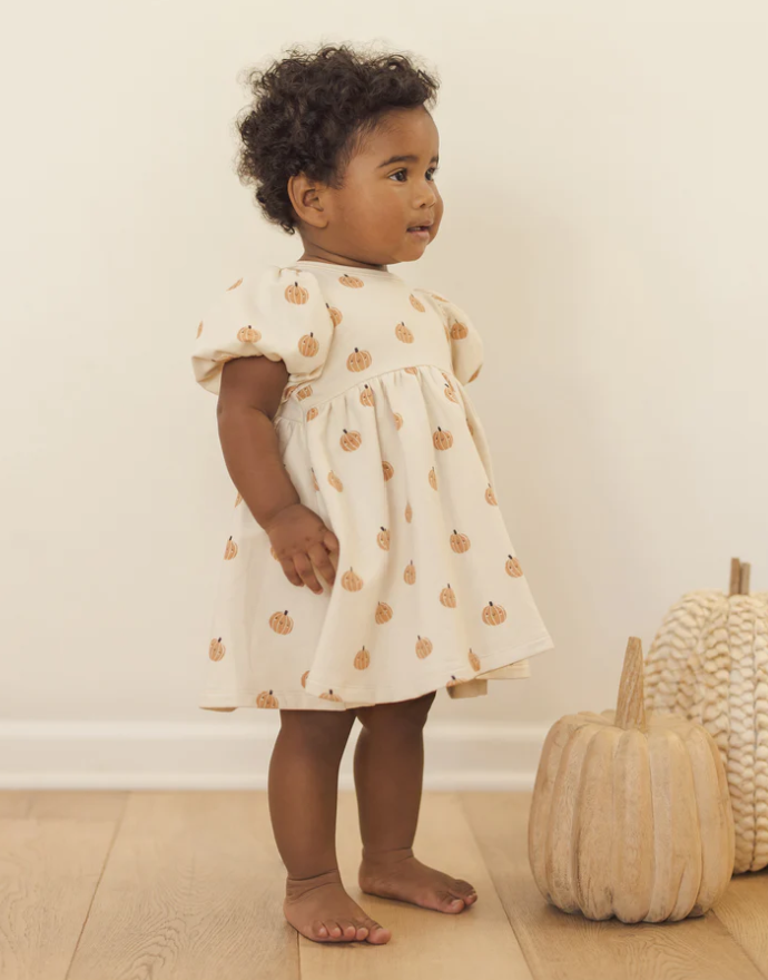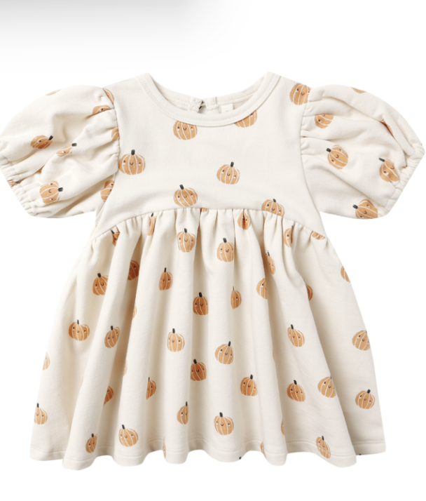 Our fleece Darla Dress features a babydoll silhouette with an empire waist, balloon sleeves, and a coconut button keyhole at the back. Coordinating bloomers included with all sizes.