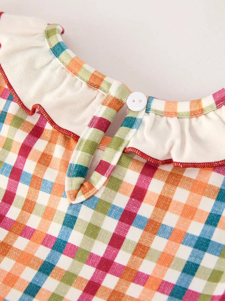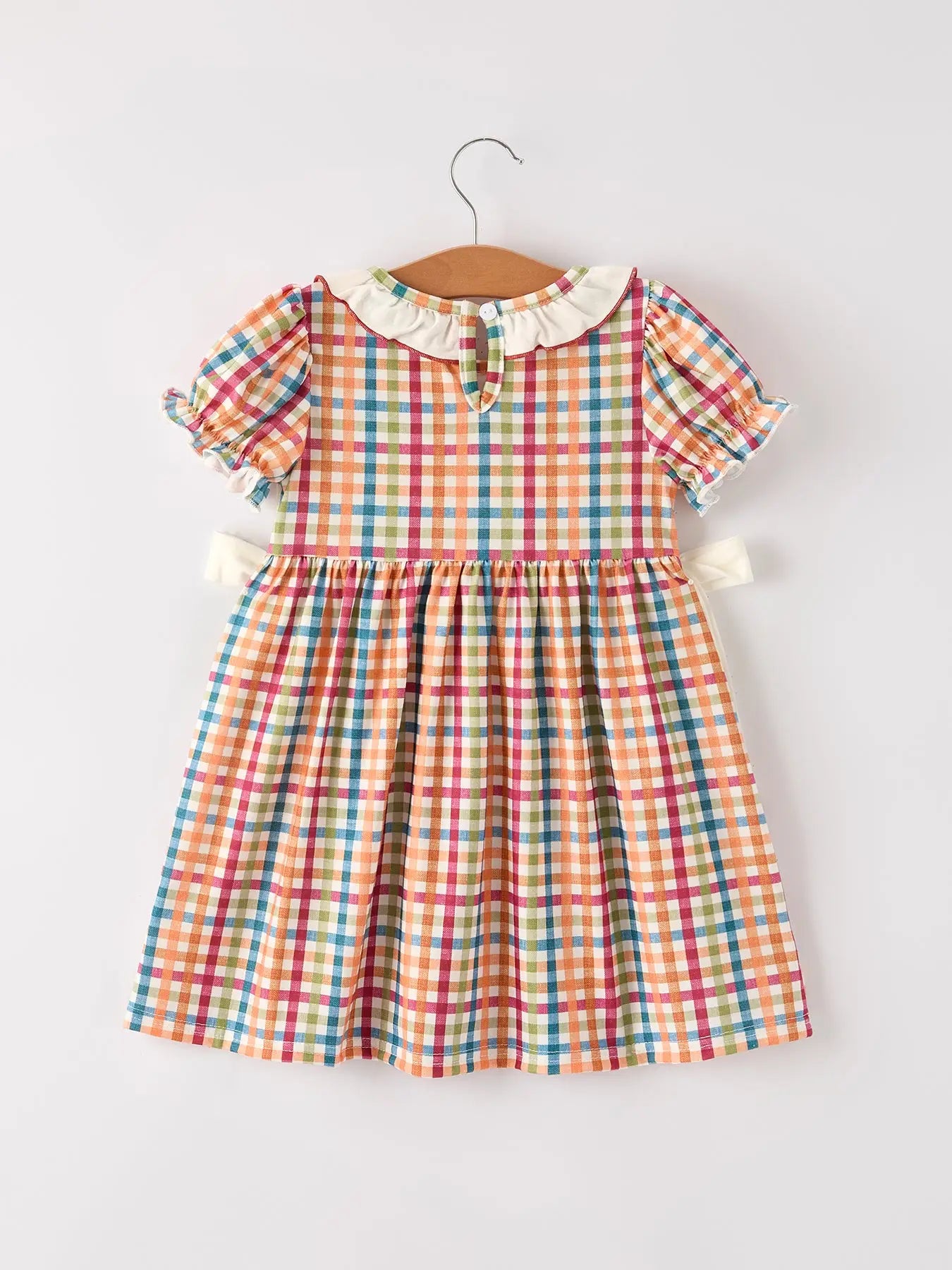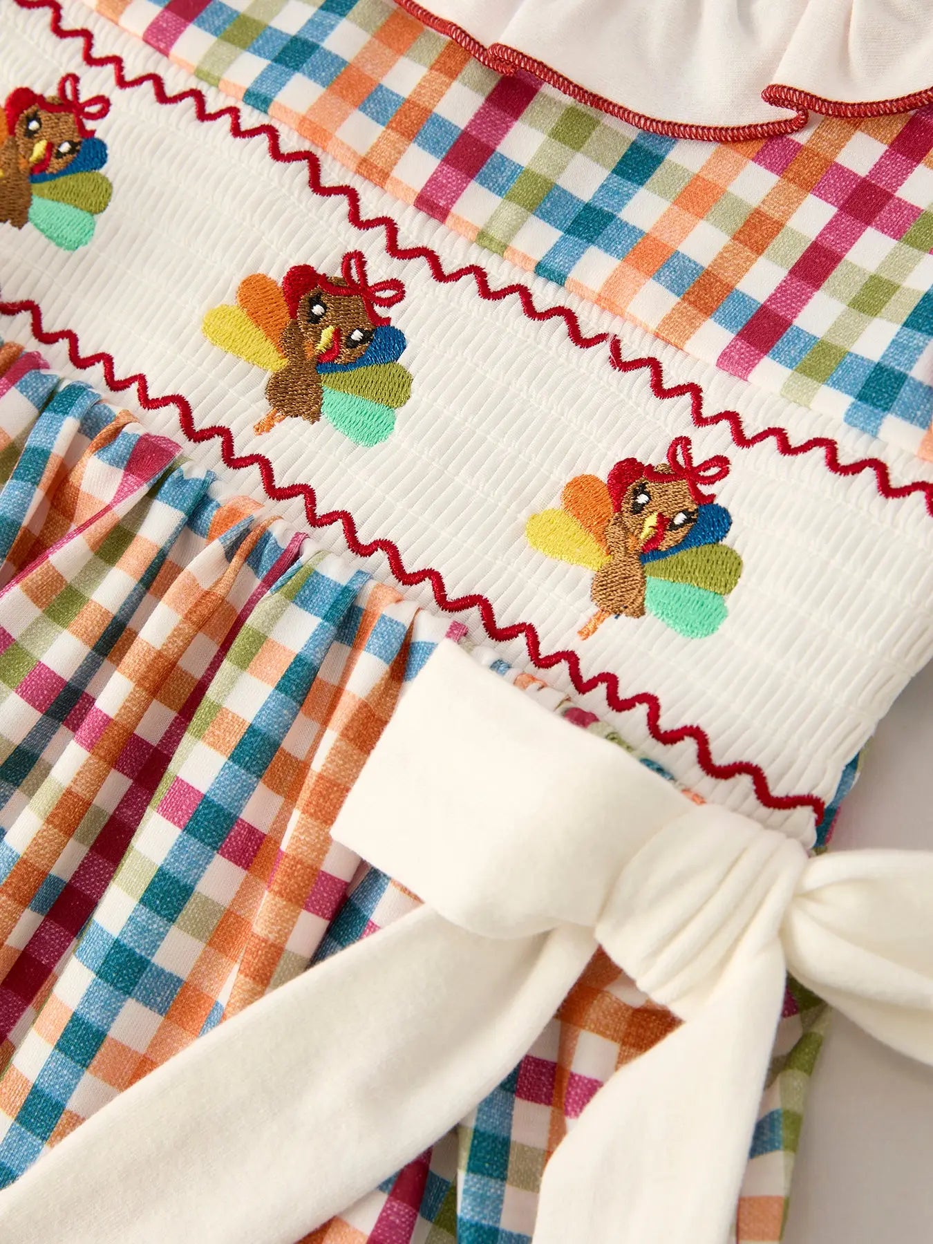 Celebrate the season in style with this charming Fall Thanksgiving Color Plaid Chick Embroidery Smocking Girls Dress. Featuring a cozy plaid pattern and delicate chick embroidery, this dress combines festive warmth with playful detail. The smocked bodice ensures a comfortable, flexible fit, perfect for all-day wear during holiday gatherings. Make your little girl’s Thanksgiving outfit both adorable and memorable with this beautifully crafted dress. SKU:DRG53229 body: 95% Polyester 5%Spandex combo:100%Cotton