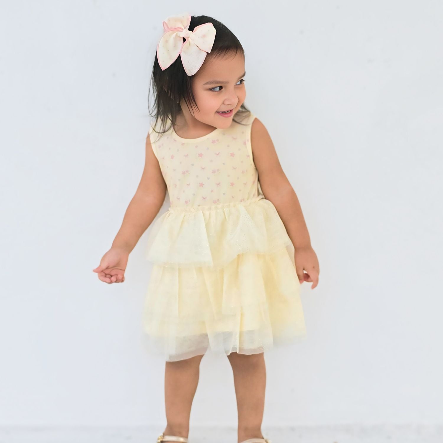 This soft fabric bow clip features a delicate pastel floral print, perfect for adding a sweet, gentle touch to any hairstyle. Features: *Pastel yellow bow with a multicolor floral and bow print pattern *Ribbon-covered alligator clip to grip the hair *Glitter accents are “shed free” *One size fits all Pair this hair clip with a matching Sweet Wink tutu and shirt for a complete head-to-toe outfit!
