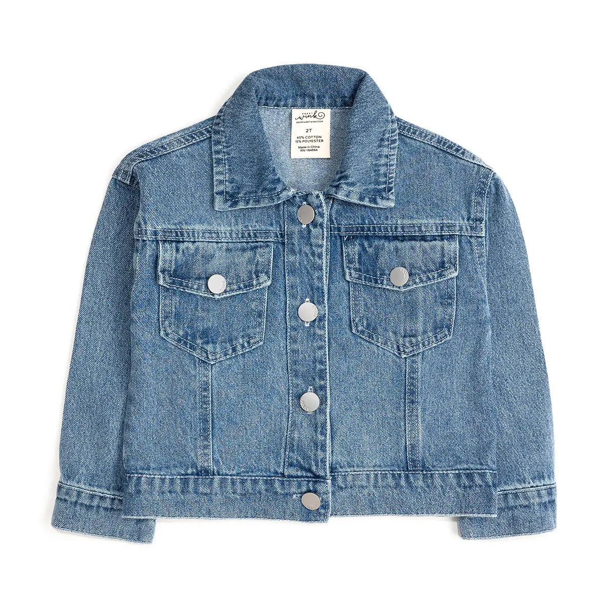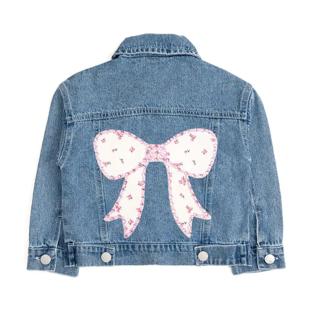 This adorable little girls’ denim jacket features a statement pink bow on the back, outlined with shimmering pearls and sparkling gemstones for the ultimate touch of sweetness. A perfectly playful layer that adds sparkle to every outfit! Features: * Jacket Color: Denim *