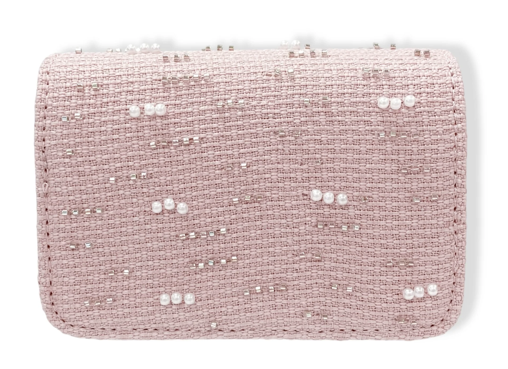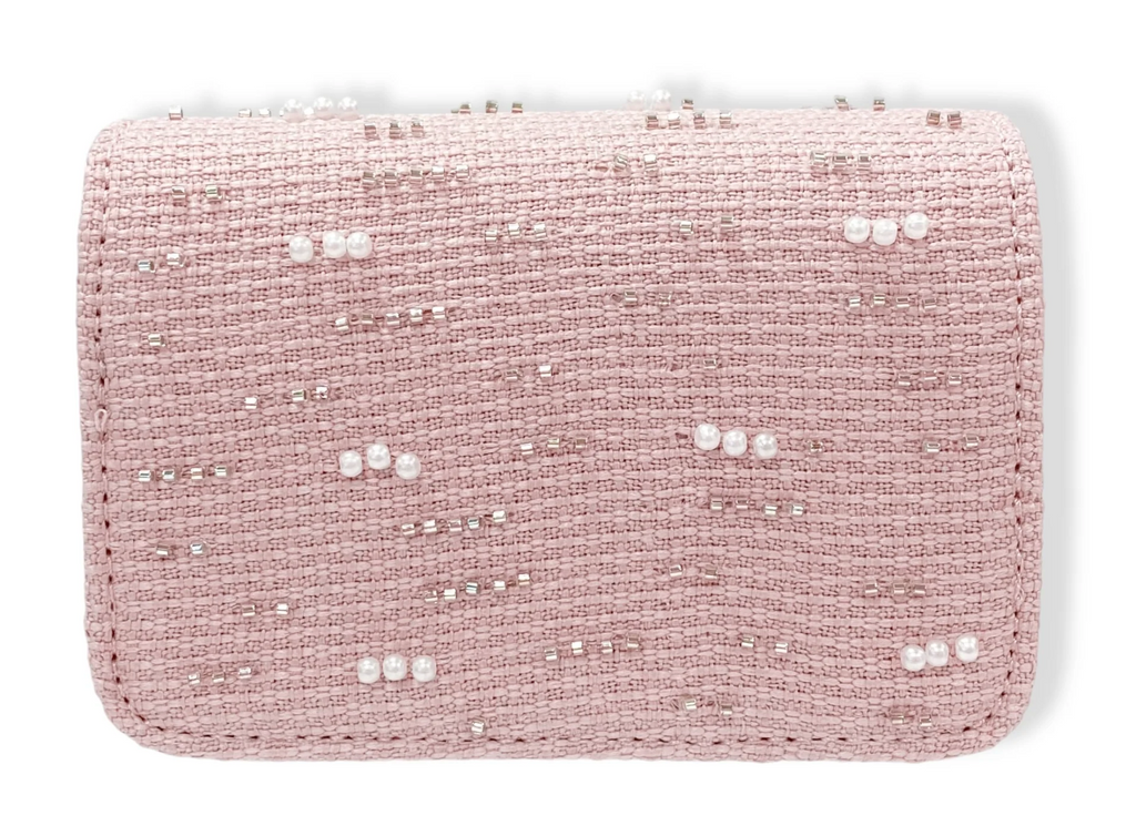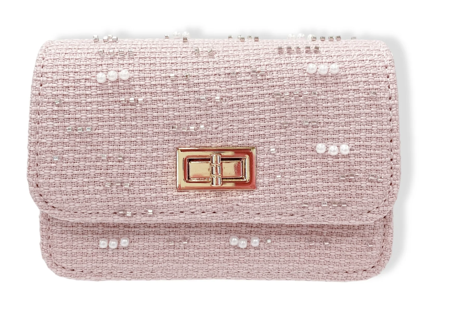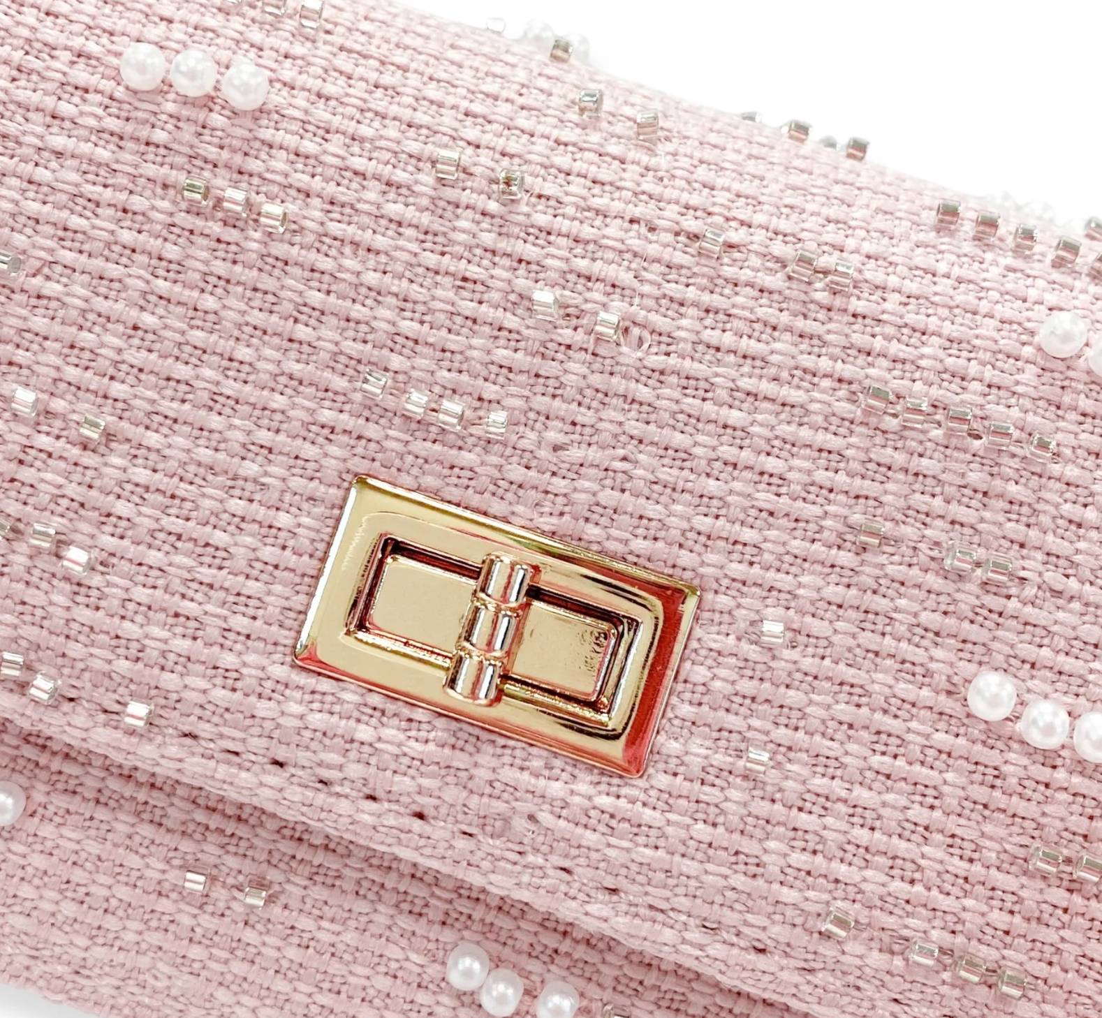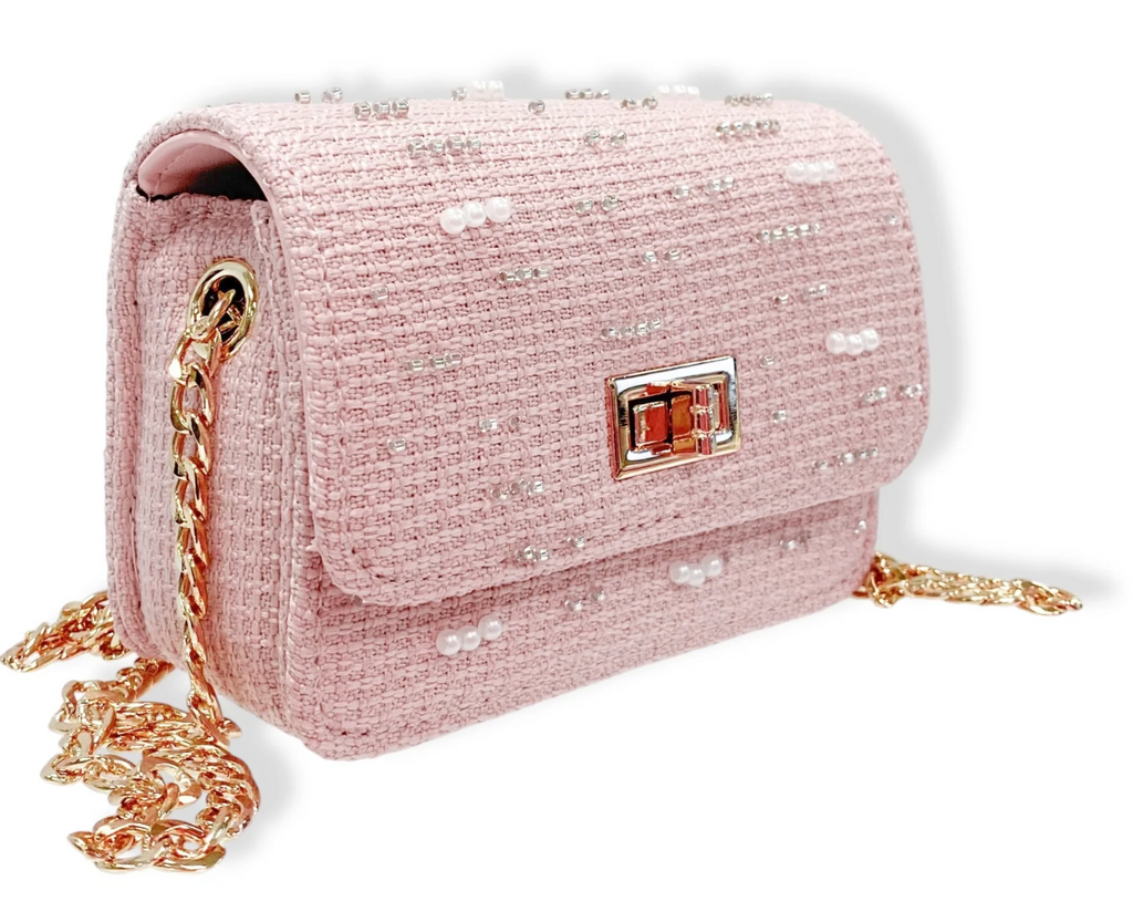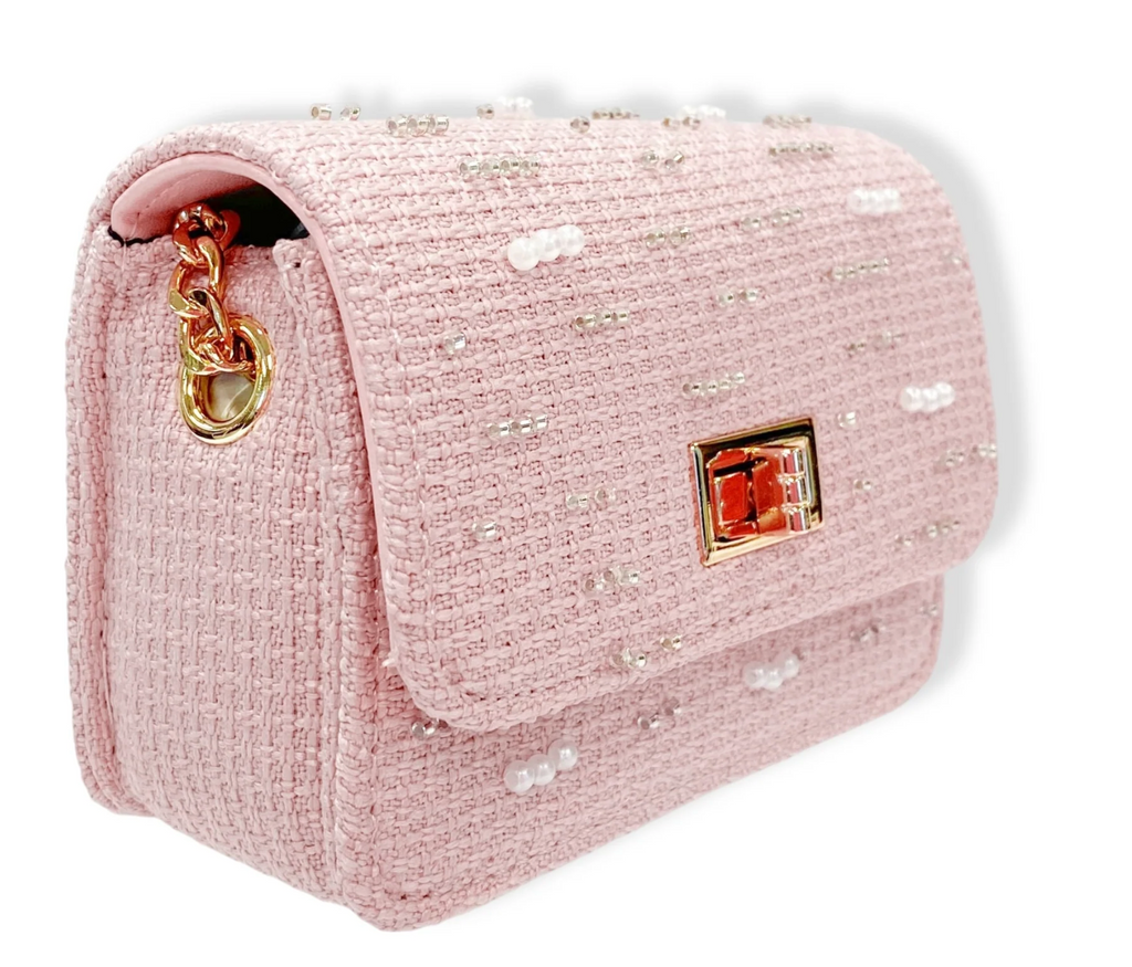 This pink tweed purse is an elegant addition to any little girls purse collection! It is decorated with detailed beading and pearls. Detachable gold chain included.