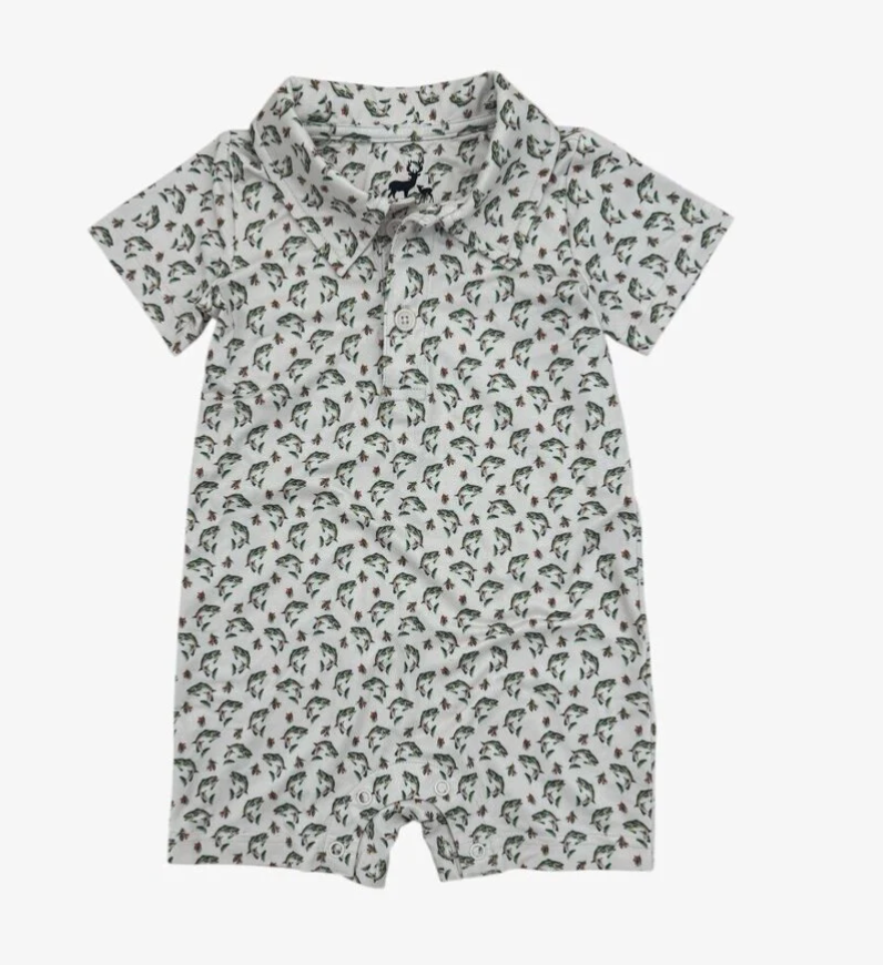 Made for sunshine and southern adventures, this baby boy jumper is crafted from our proprietary CoolShade™ fabric - lightweight, breathable, and packed with UPF 50+ sun protection. Featuring our 'trout traditions' all over rainbow trout print, this short sleeve one piece keeps your little guy cool, covered and comfortable from backyard hangs to boat days.