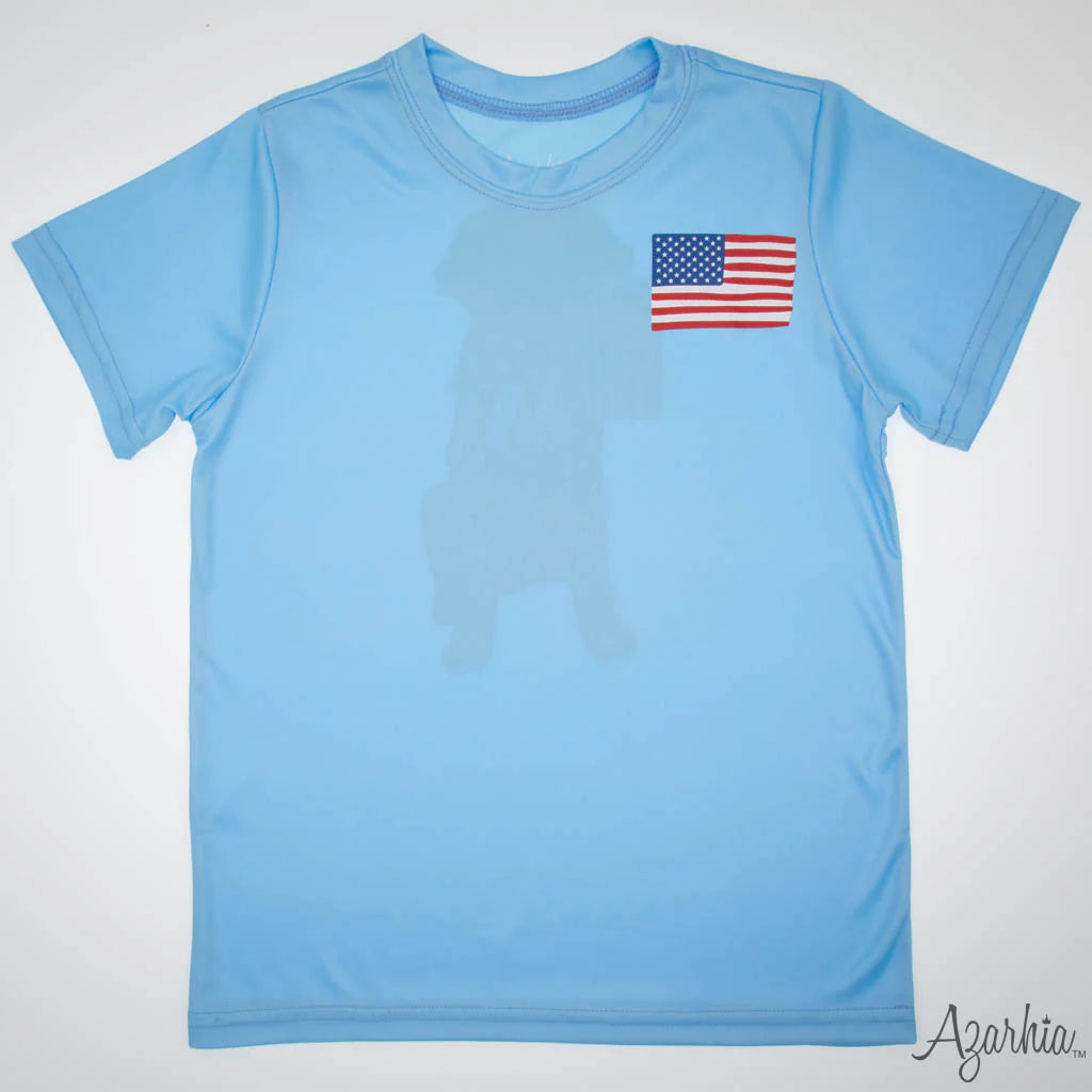 Get ready to rock your workout with this American Lab Screen Print on Light Blue Dri Fit. It's the perfect combination of fashion and function, making it a must-have for any fitness enthusiast!