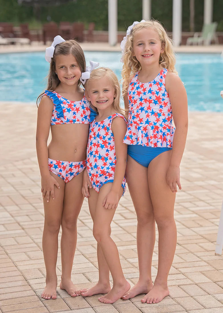 Let your little star shine bright in our Loren Two Piece Swim Set! With its cheerful colors and sweet peplum detail, this adorable swimsuit is perfect for beach adventures, poolside fun, and sunny playdates. Designed for all-day comfort and endless twirls in the sun, it's a splash of style she’ll love to wear!