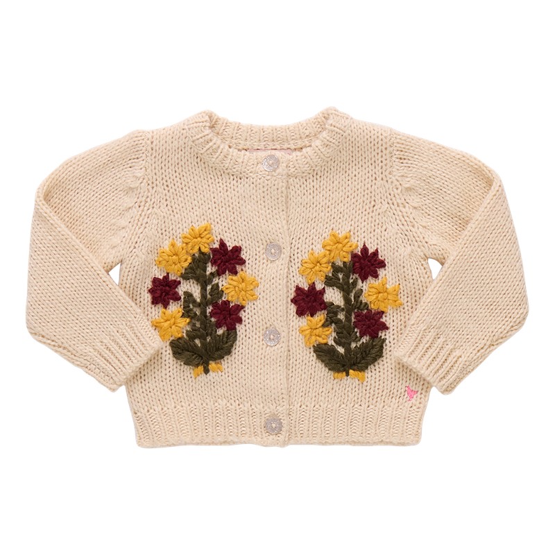 Lovely Layer! Our classic cardigan Girls Maude Sweater features a spray of mustard and paprika embroidered flowers atop a cream canvas and a twinkly silver glitter button closure. This piece is the perfect topper to our Fall collection dresses, skirts and tops. Twin with Little Sis in our Baby Girls Maude Sweater.