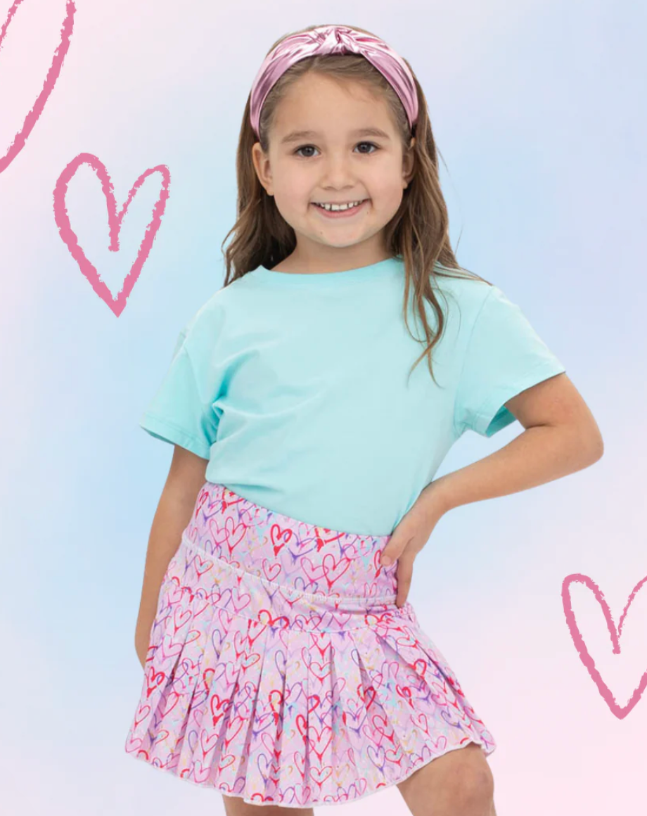 This playful heart-print skort is made for twirls, tennis, and Valentine’s fun. Featuring a soft pastel base splashed with colorful hand-drawn hearts, it blends a flirty skirt look with the comfort and coverage of built-in shorts. The stretchy waistband keeps it comfy for all-day play while the flowy overlay adds sweet movement with every step.