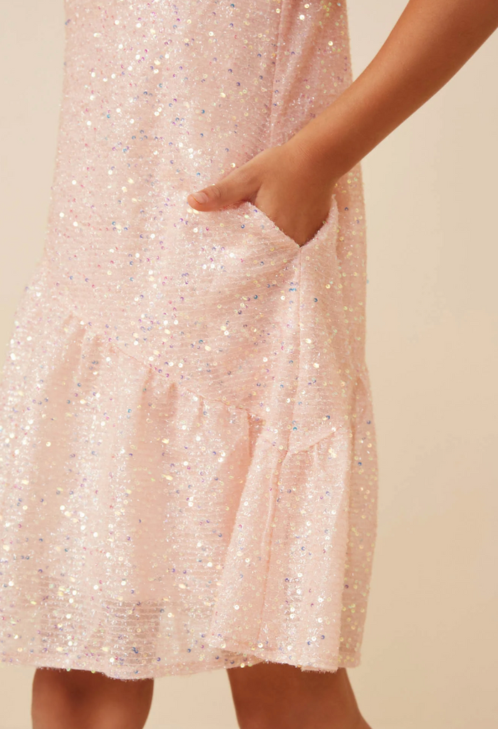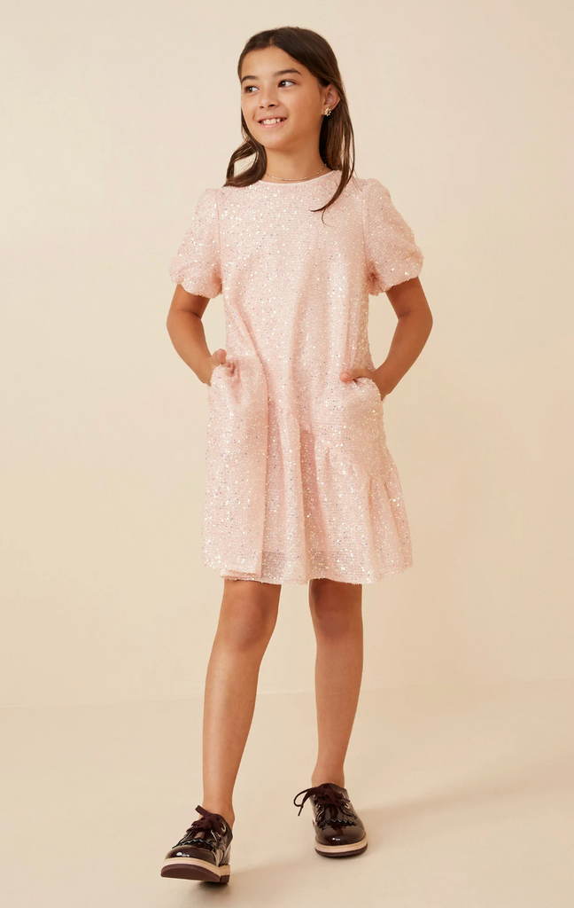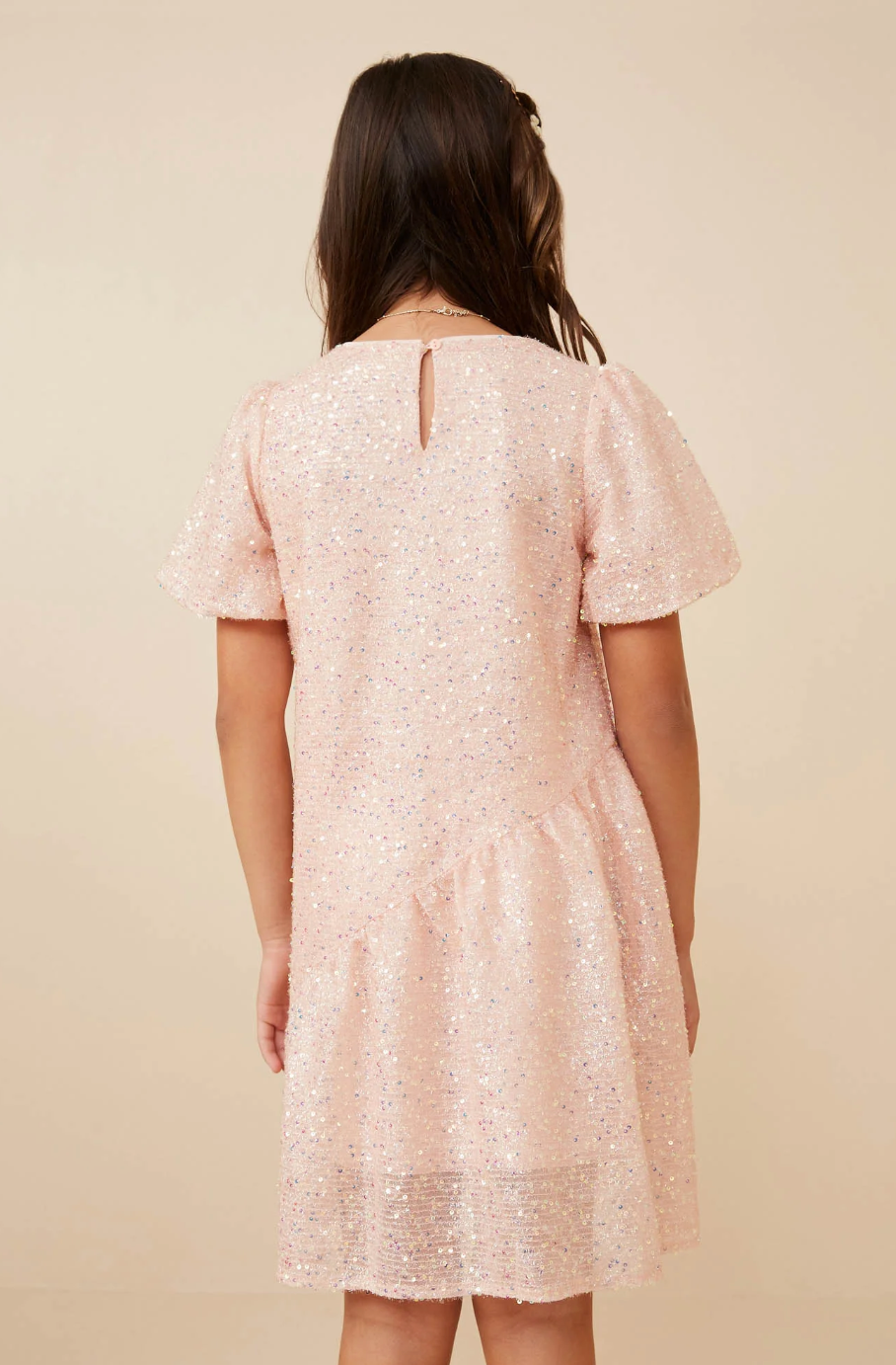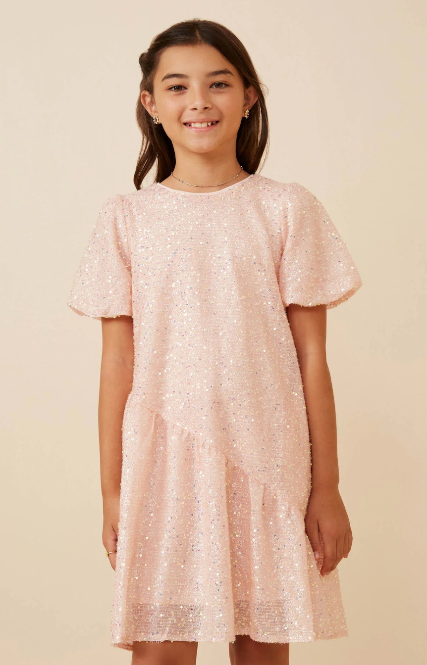 Our Sequined Asymmetric Hem Puff Sleeve Dress Features: