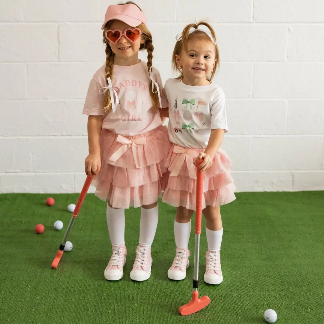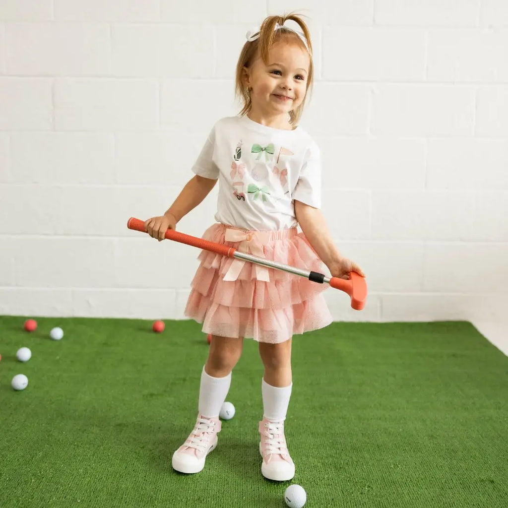 The Coquette Golf Girl Short Sleeve T-Shirt is a trendy and sporty t-shirt for any golf fan! Features: * Shirt Color: White * Graphic Color: Multicolor * Material: 100% Cotton * Features: Tagless inside neck label for an itch-free wear * Fit: Toddler Unisex; True to Size * Care: Machine washable, tumble dry low Each t-shirt is hand pressed with love using baby and child safe inks.