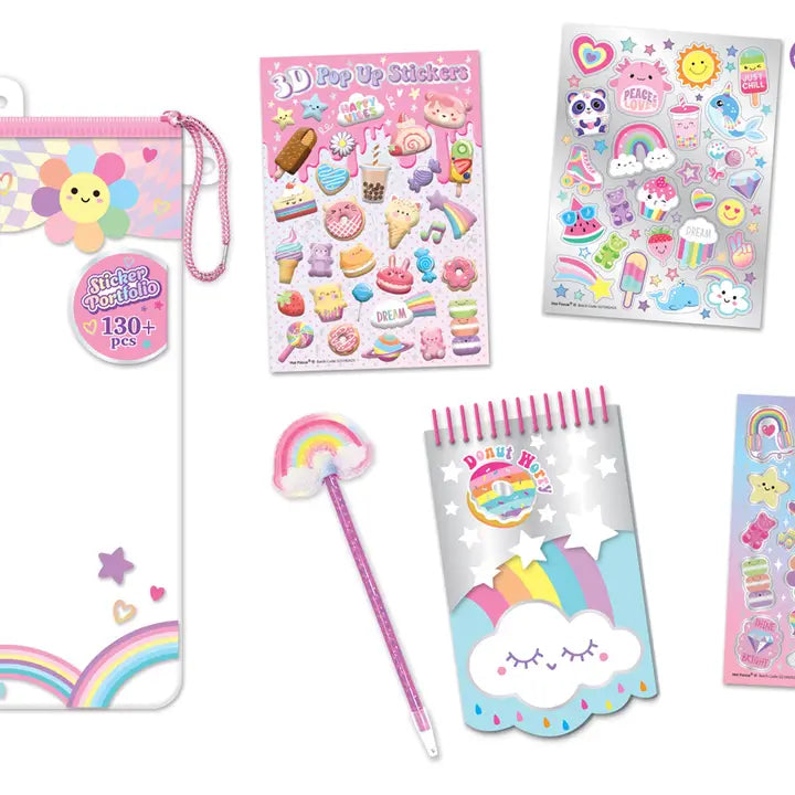 All about stickers. This set has tons of fun and trendy stickers. Contain: 1 Sheet of Bubble Stickers with Sequins 2 Sheets of Vinyl Stickers 1 Sheet of Glow in the Dark Stickers 1 Reusable Bag 1 Notebook 1 Butterfly Pen