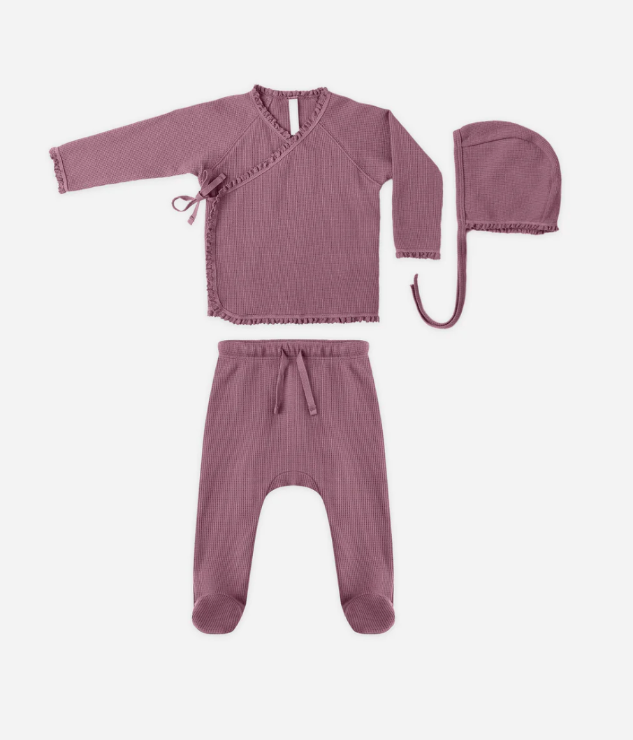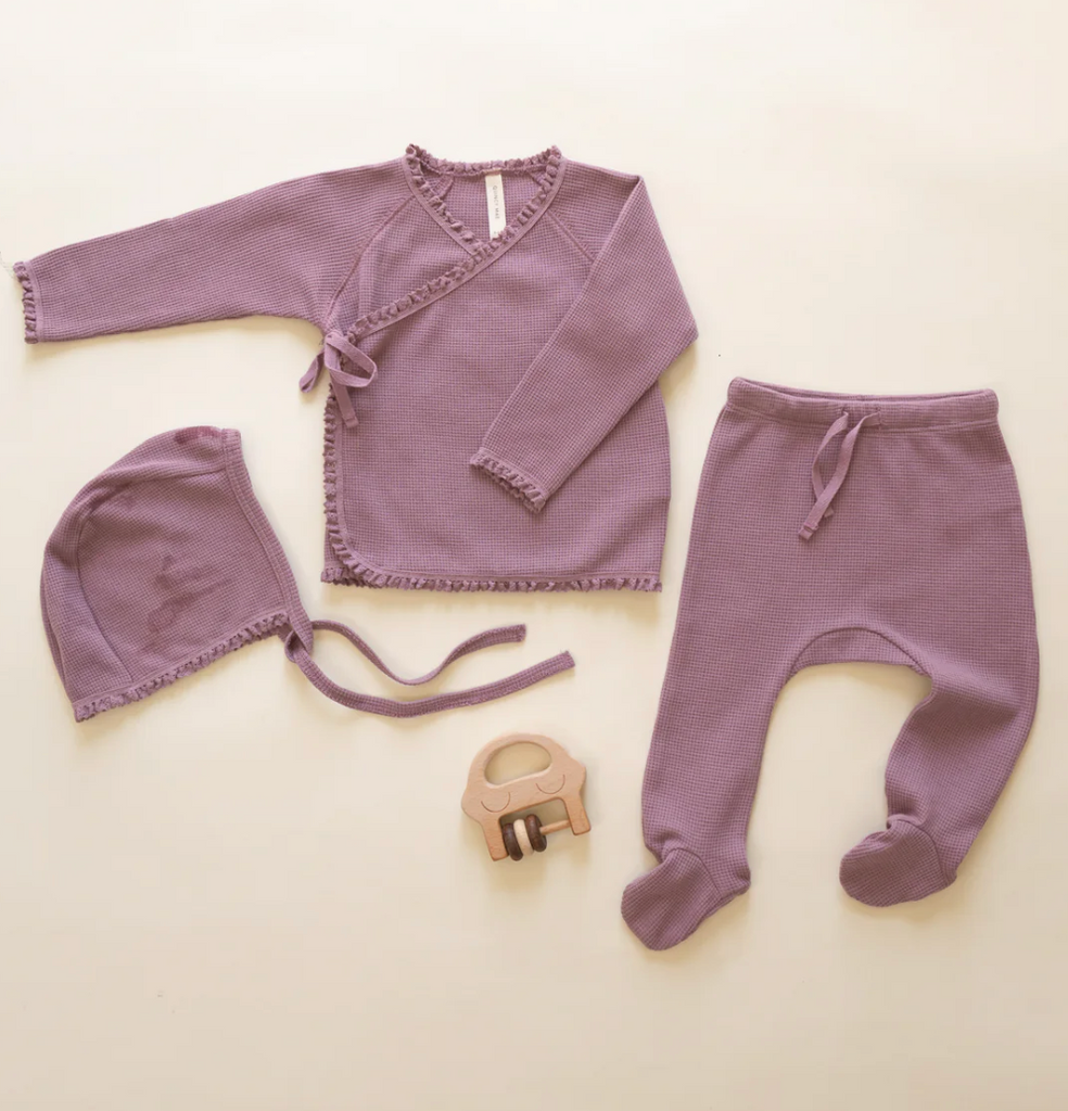 Our Take Home Set in soft, lightweight waffle fabric is the perfect outfit for welcoming your newborn. This sweet set includes a bonnet, a wrap snap and tie top, and footed drawstring pants.