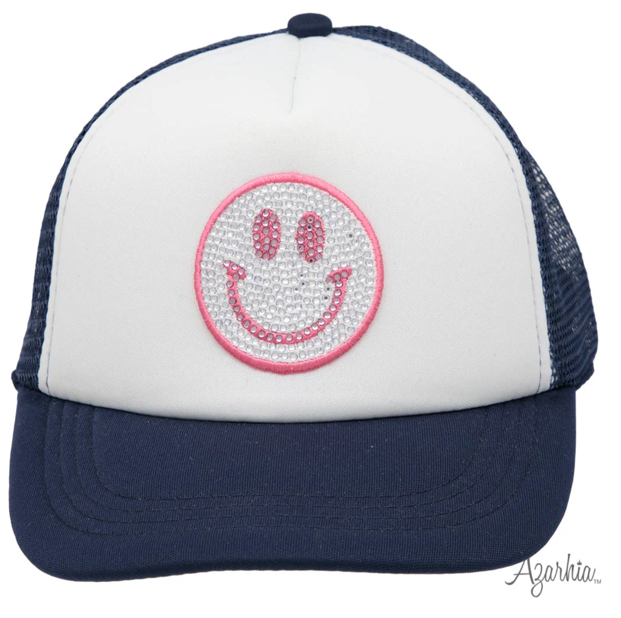 This solid navy trucker cap features a hot pink rhinestone smiley, combining classic style with a vibrant, eye-catching detail.