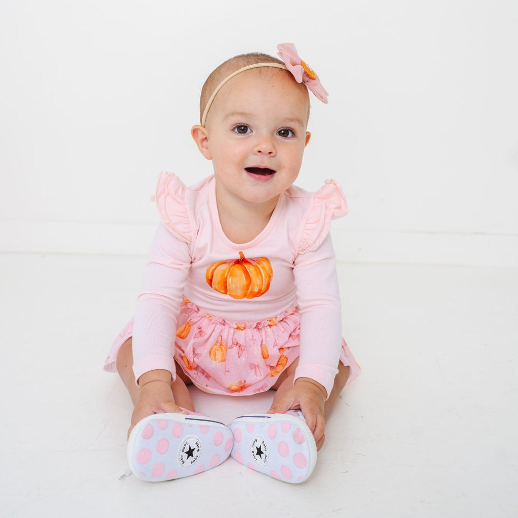 The Coquette Pumpkin Long Sleeve Tutu Bodysuit is a fun and festive bodysuit for babies celebrating Fall!